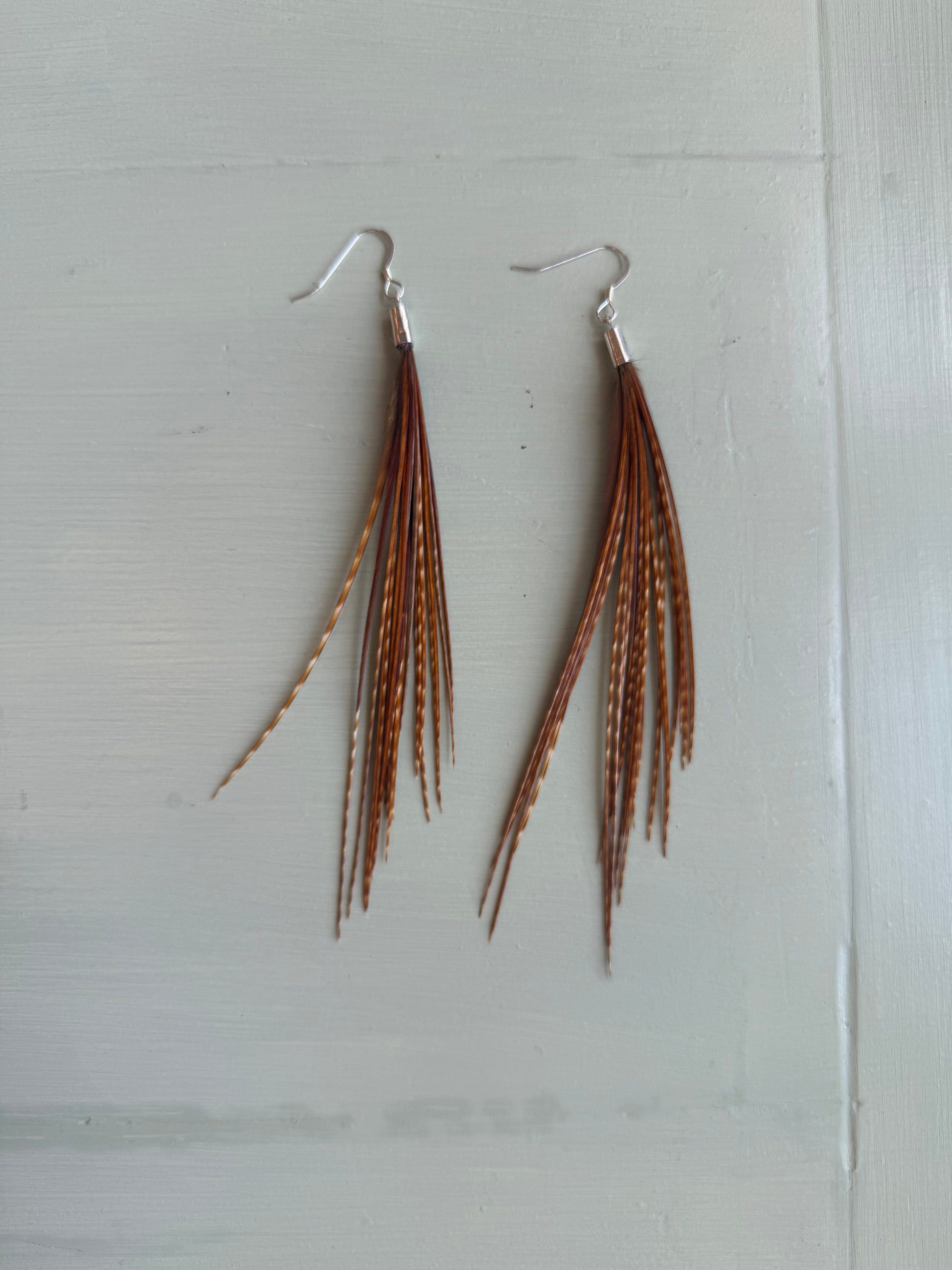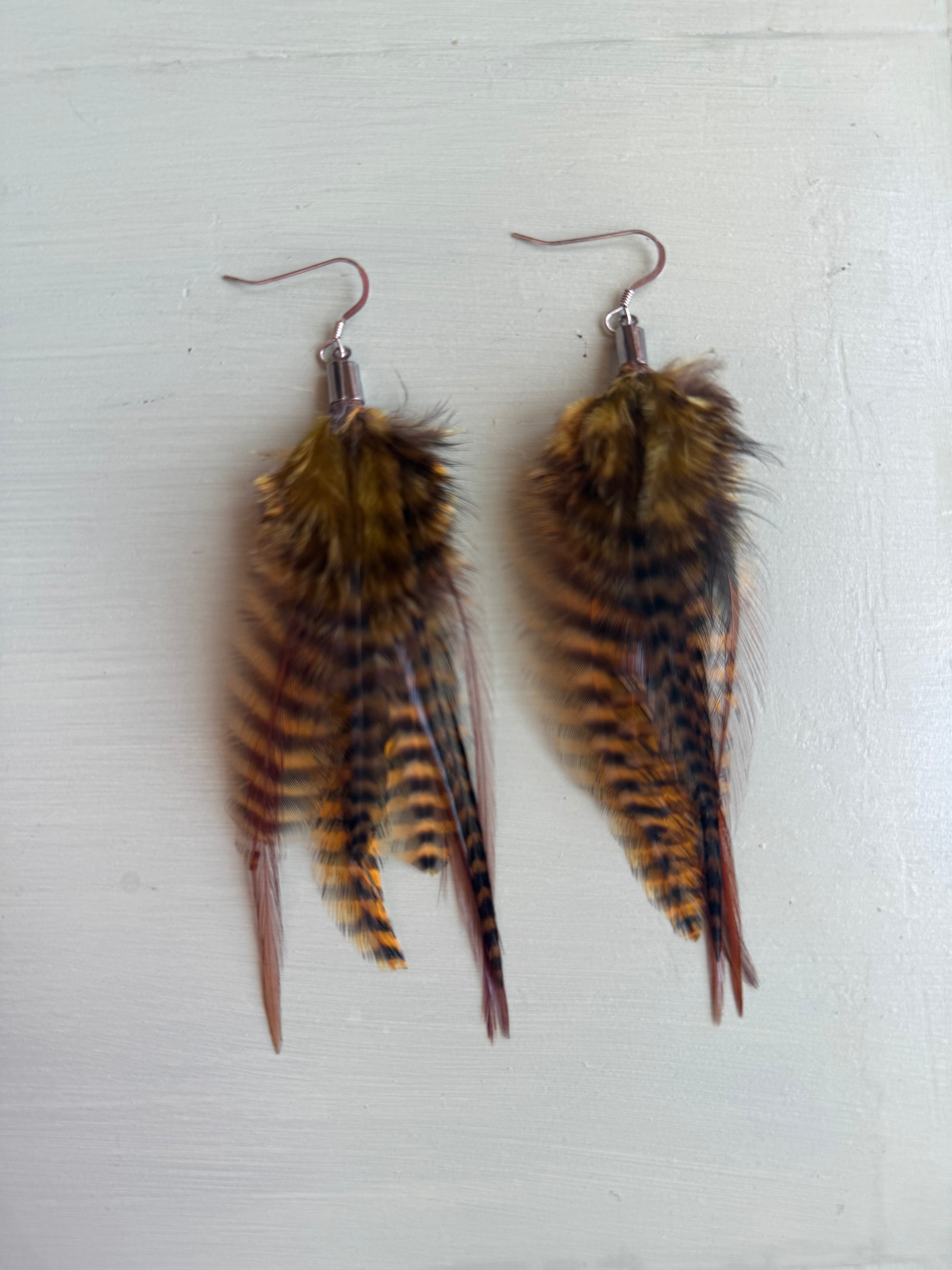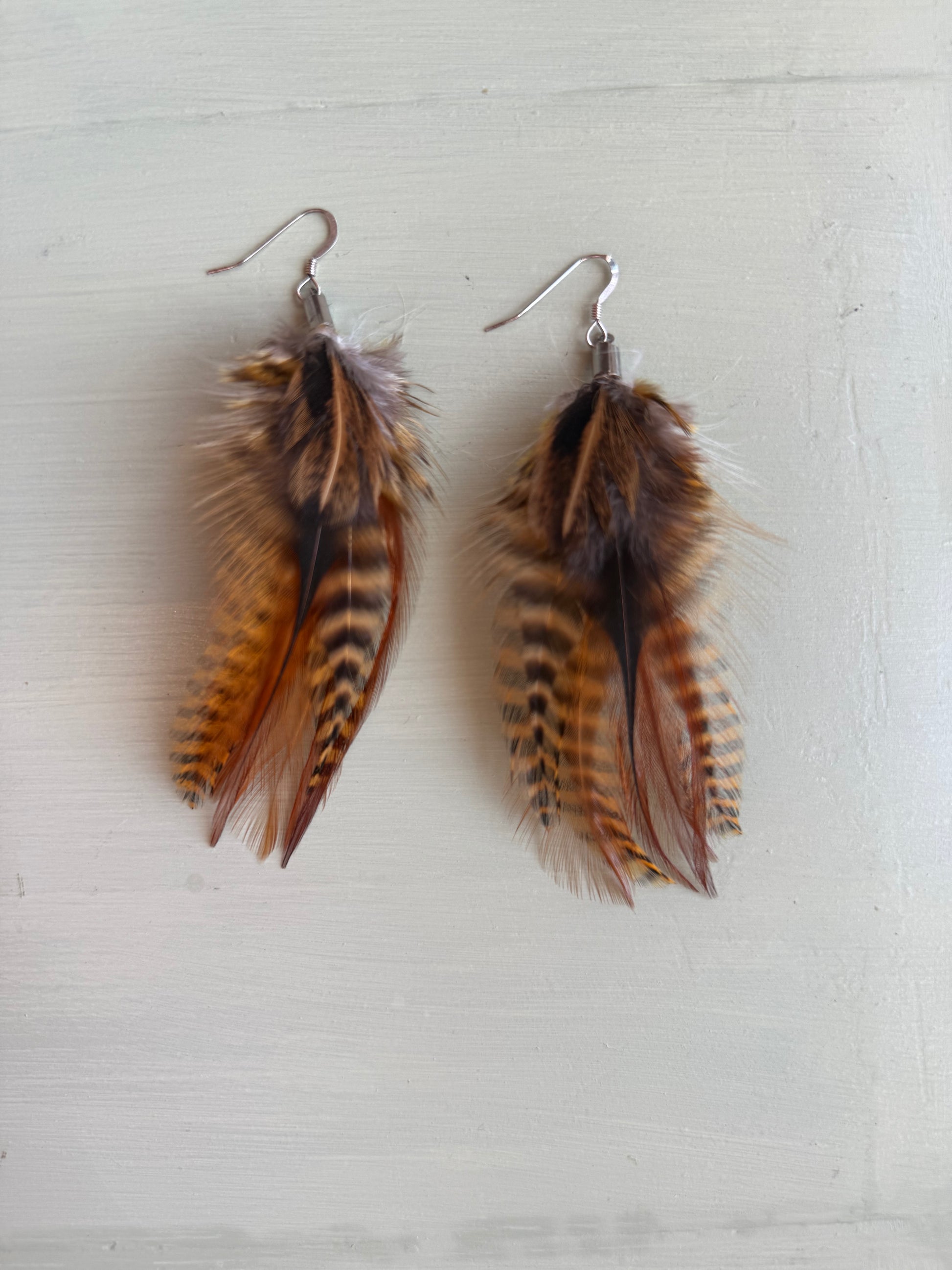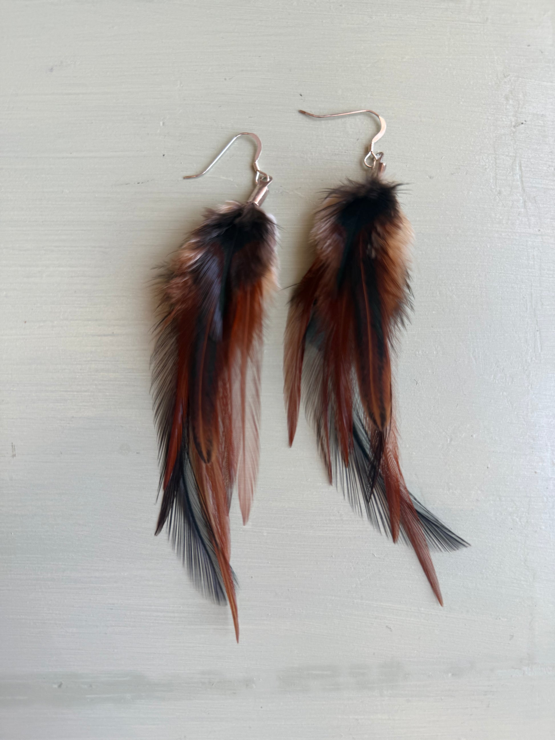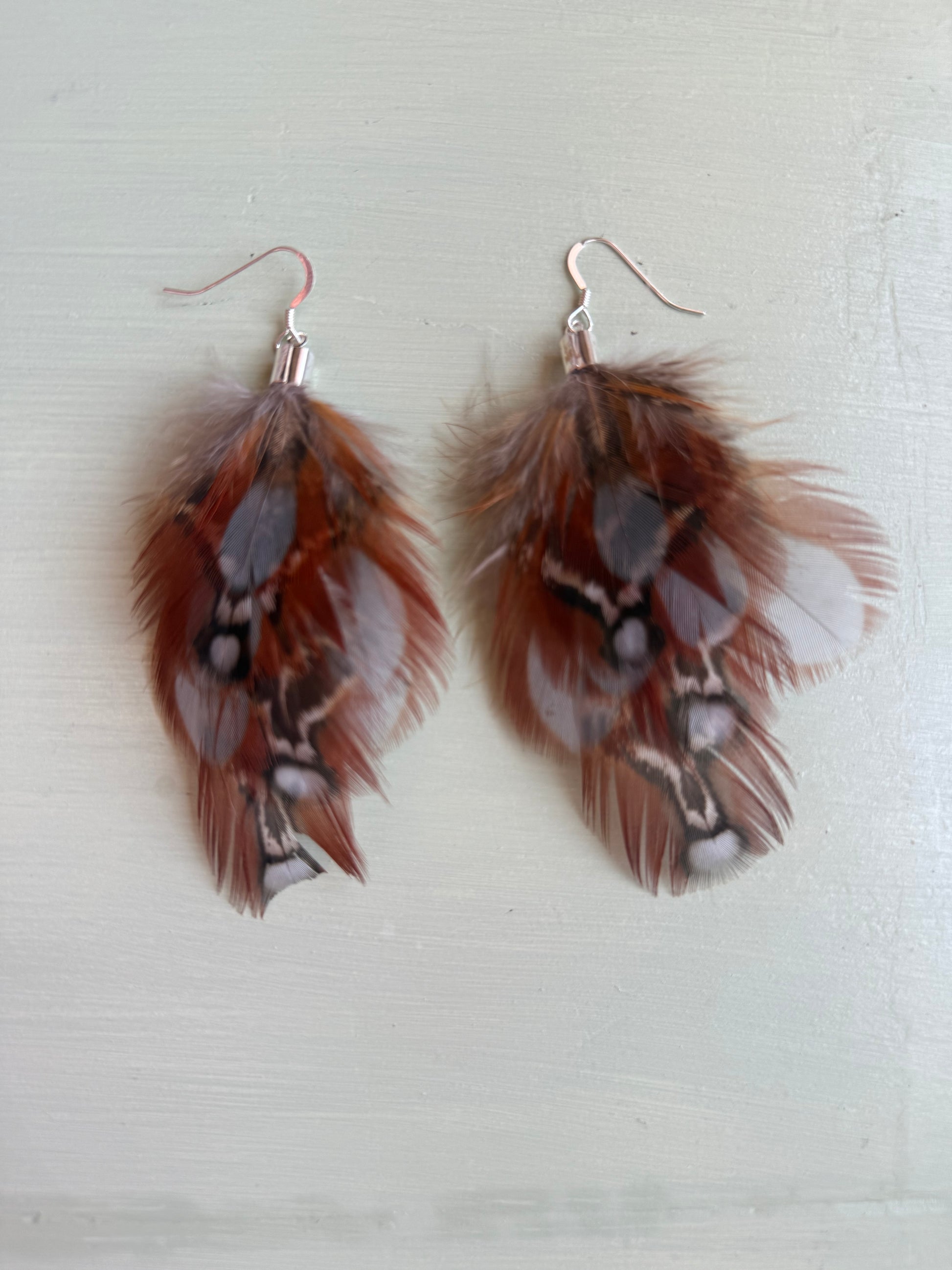Rosanna gör alla fjäderörhängen i par. En del är naturligt färgade och en del har färgats för hand. Allt mönster på fjädrarna finns där naturligt.