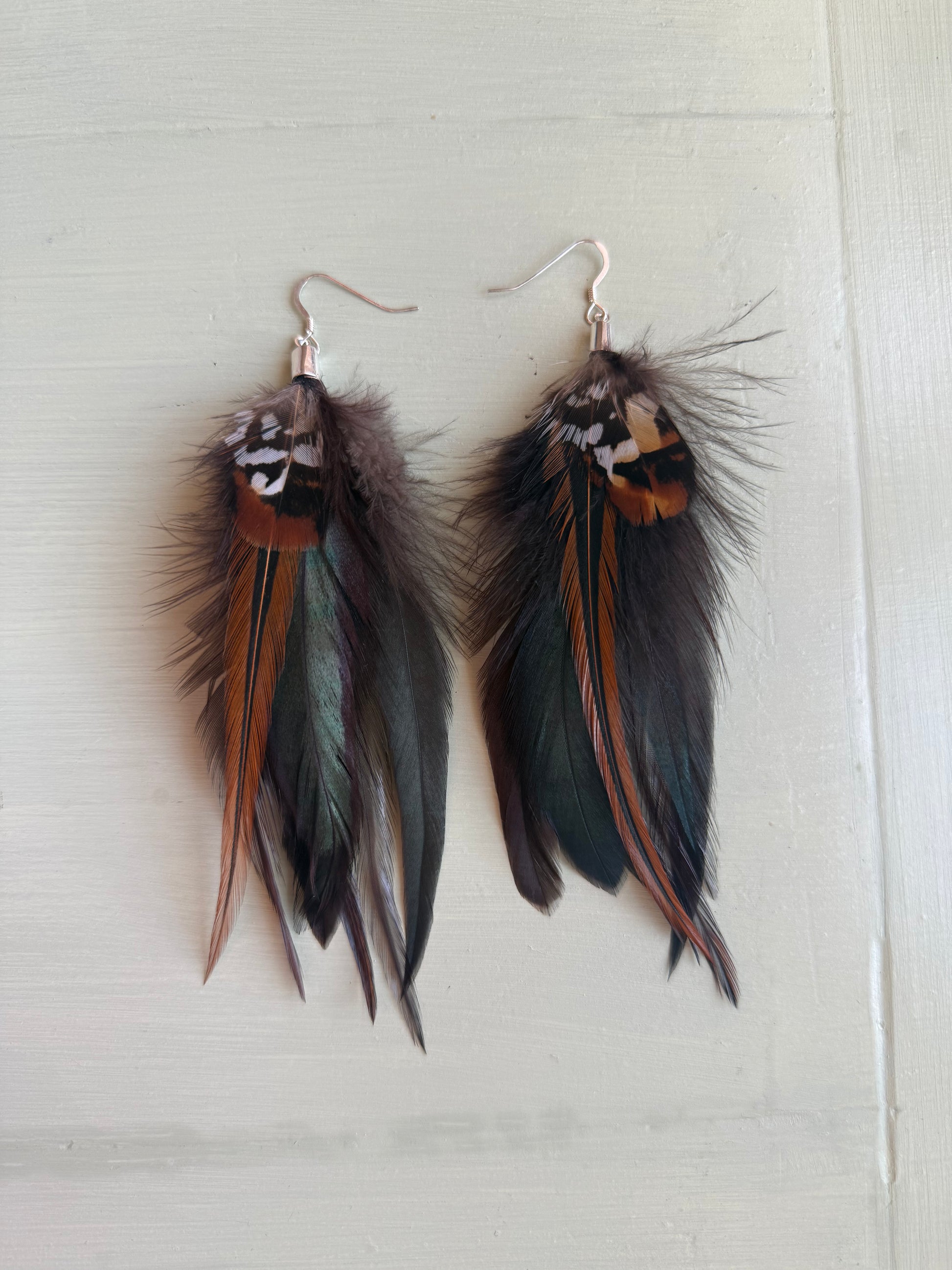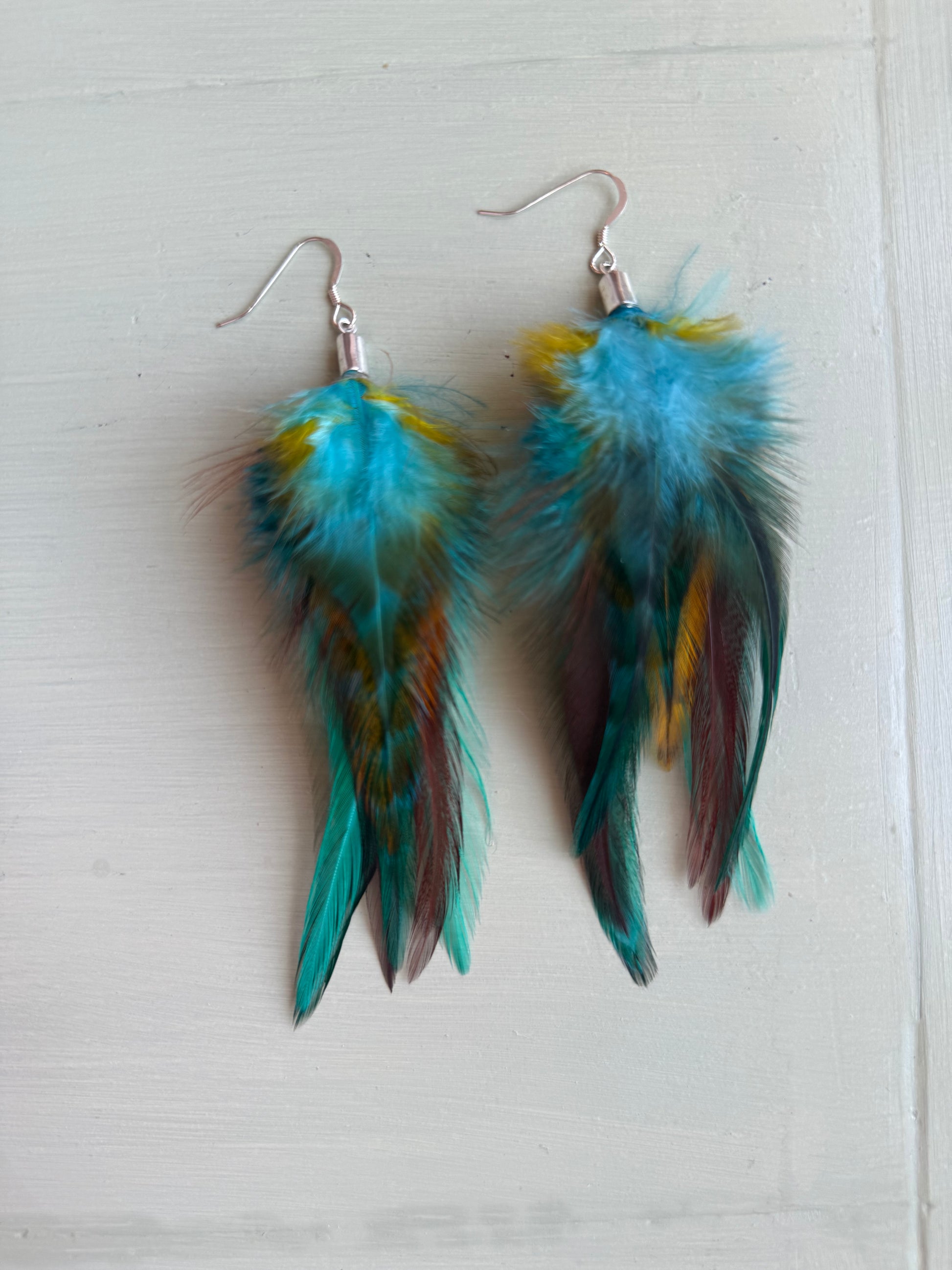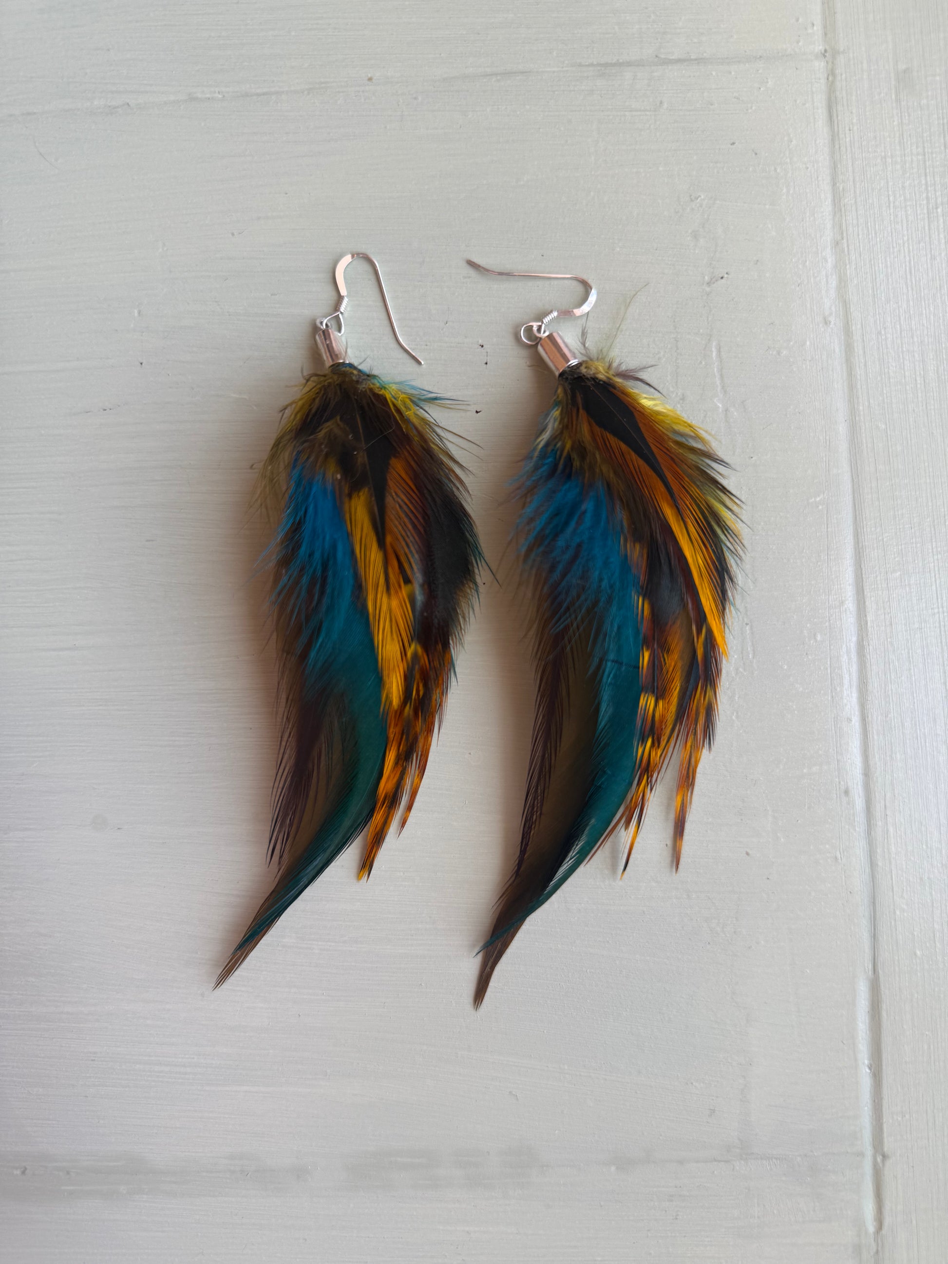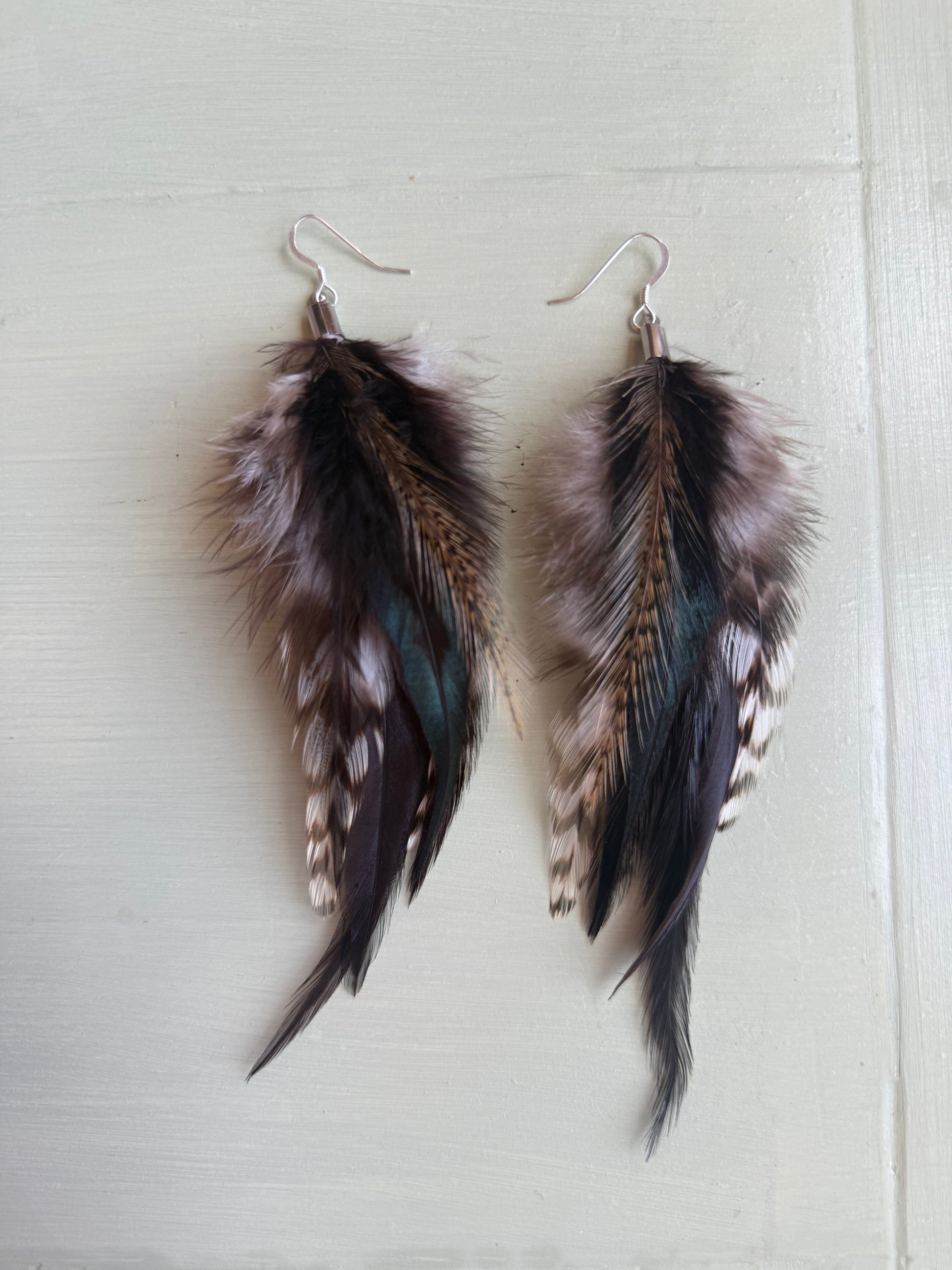Rosanna gör alla fjäderörhängen i par. En del är naturligt färgade och en del har färgats för hand. Allt mönster på fjädrarna finns där naturligt.