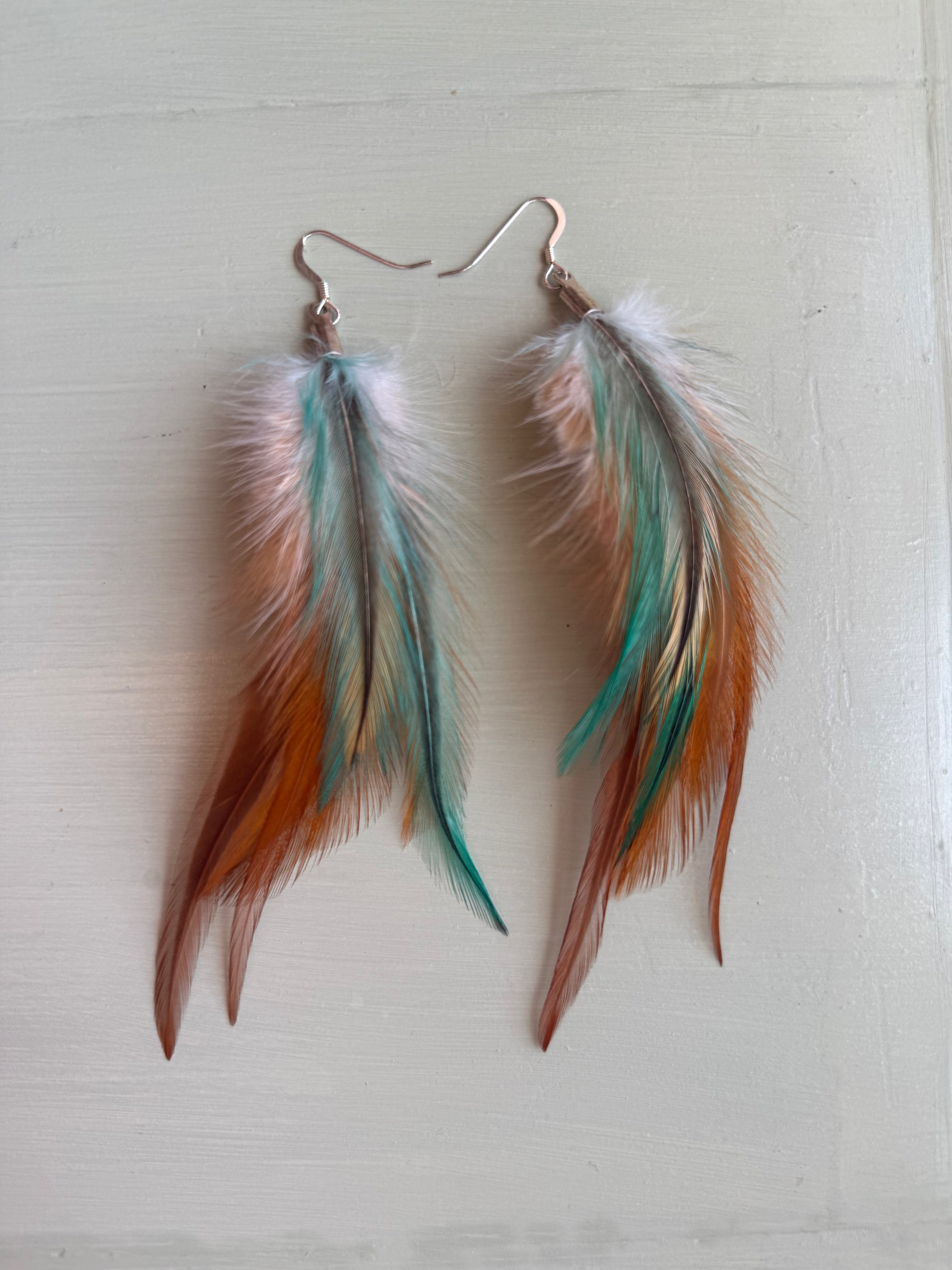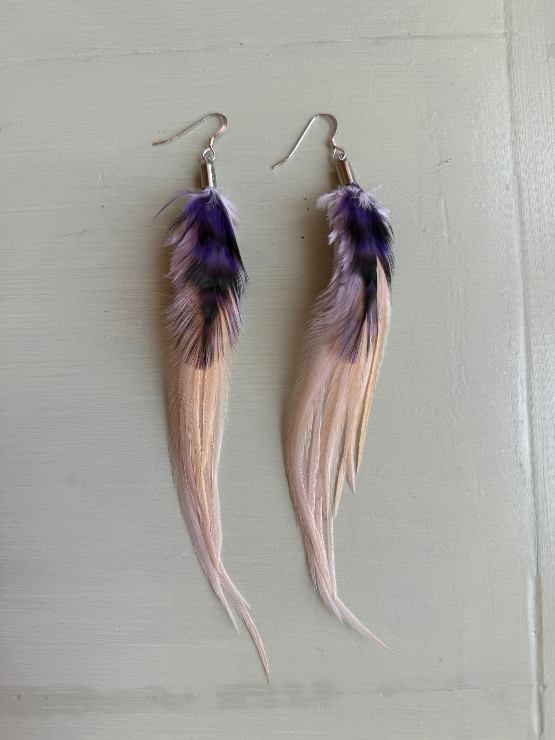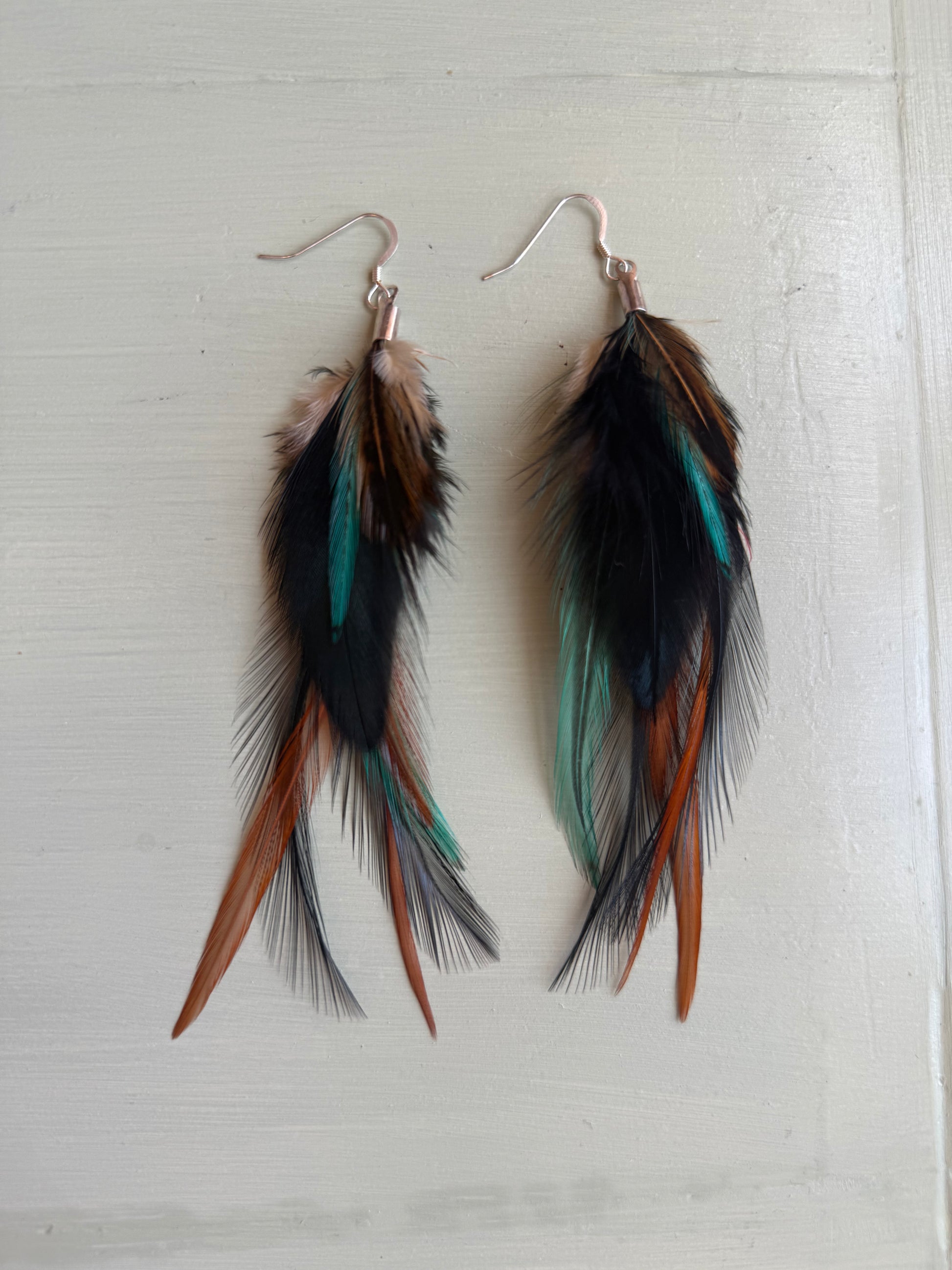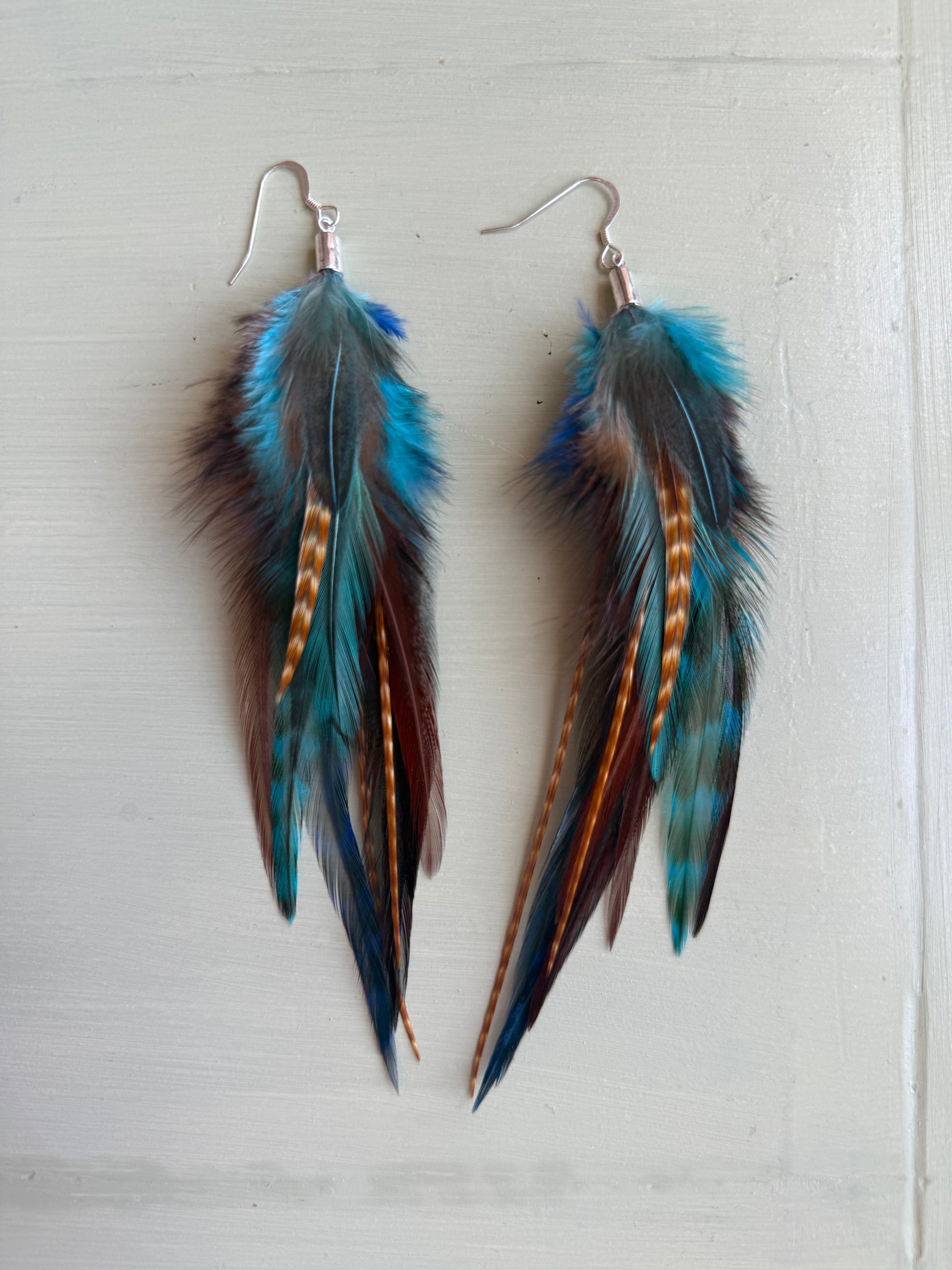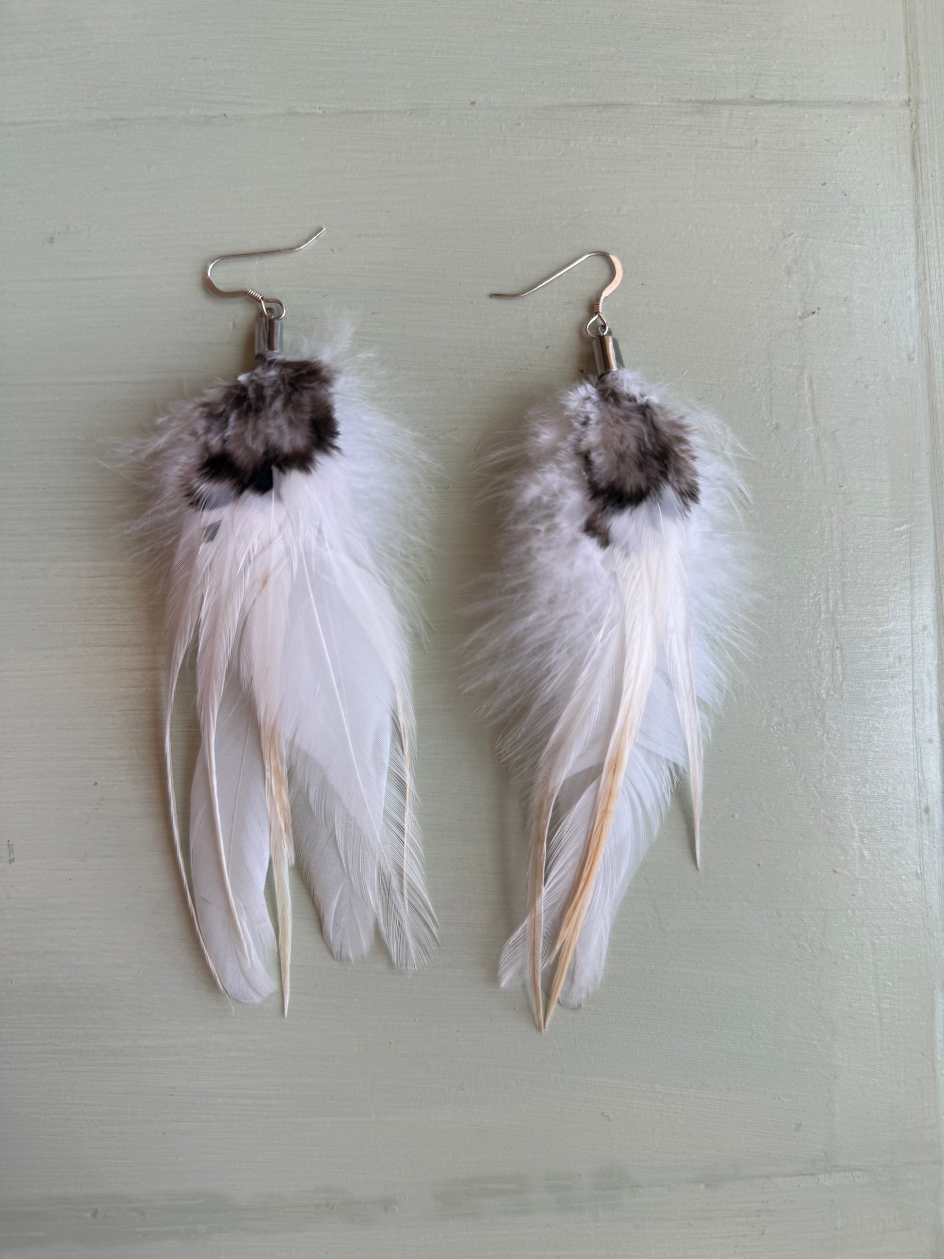 Rosanna gör alla fjäderörhängen i par. En del är naturligt färgade och en del har färgats för hand. Allt mönster på fjädrarna finns där naturligt.