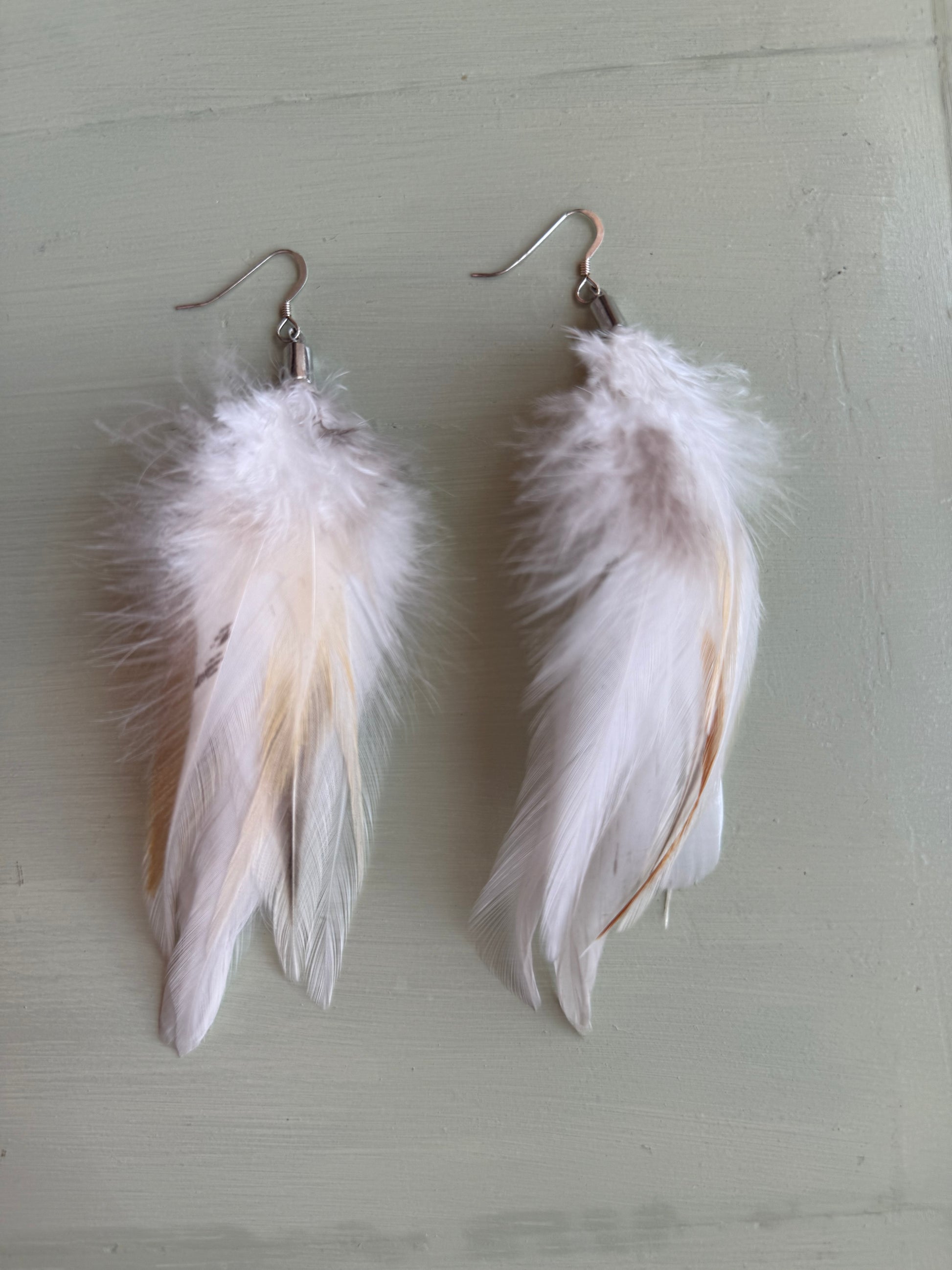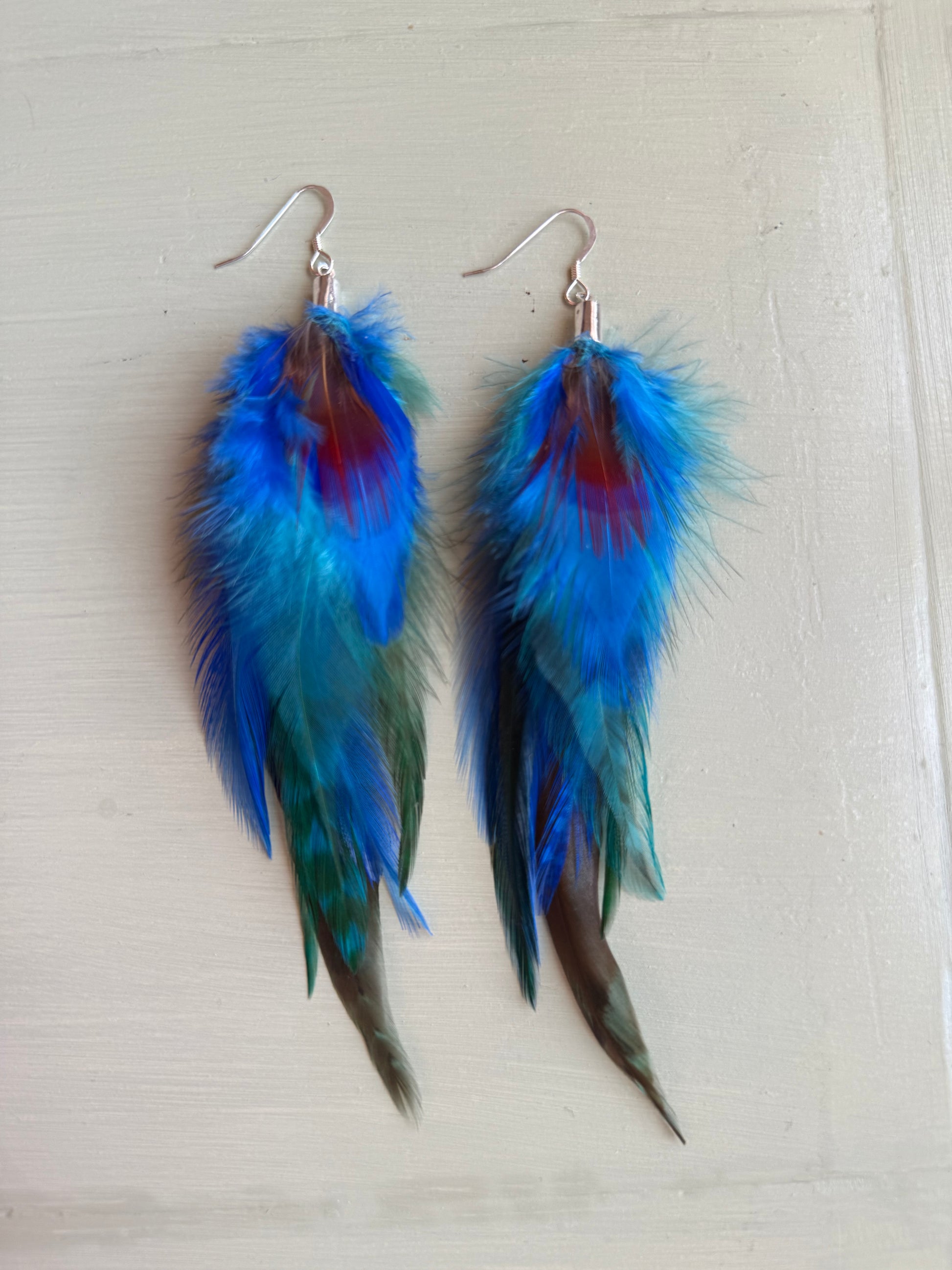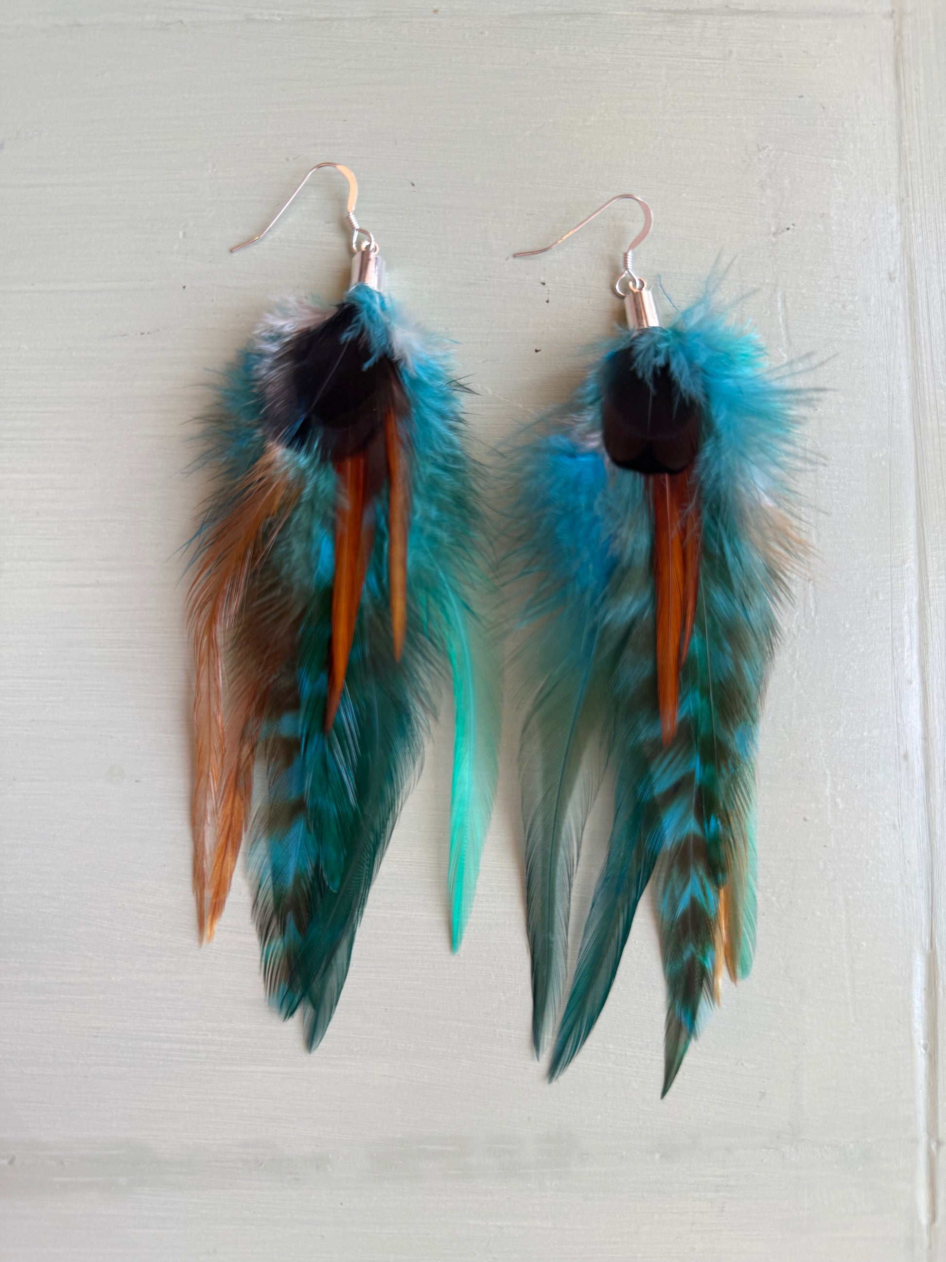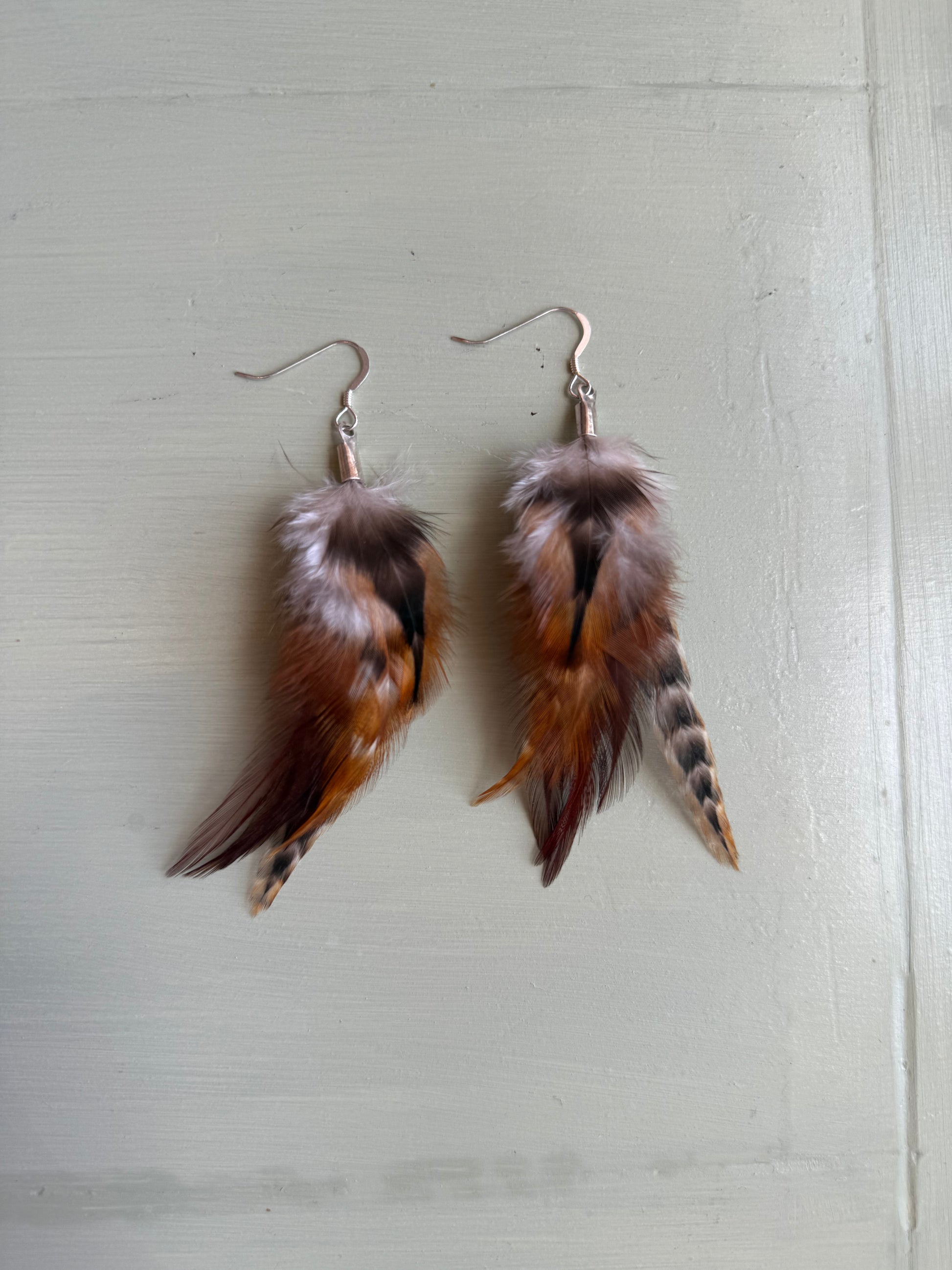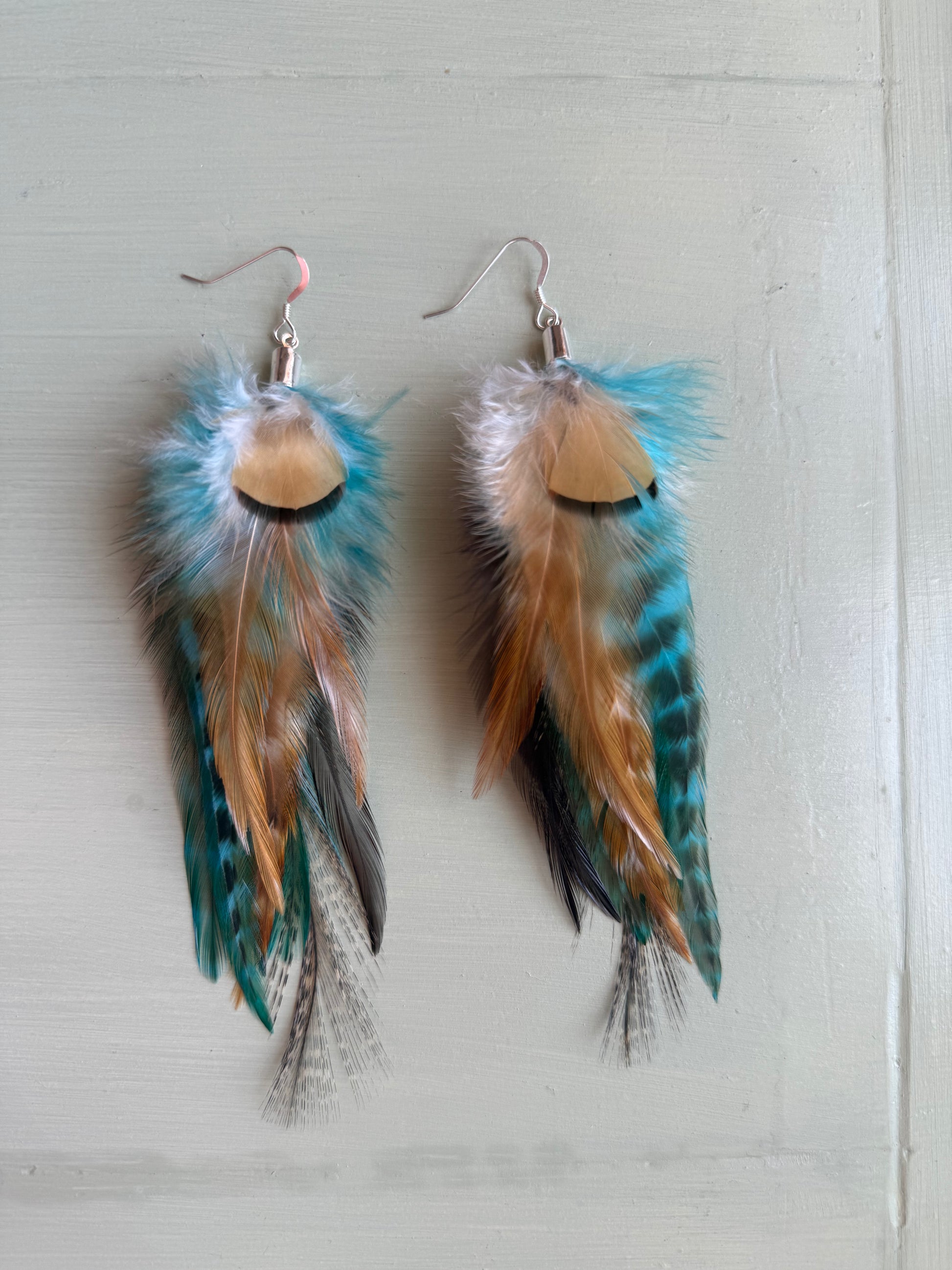 Rosanna gör alla fjäderörhängen i par. En del är naturligt färgade och en del har färgats för hand. Allt mönster på fjädrarna finns där naturligt.