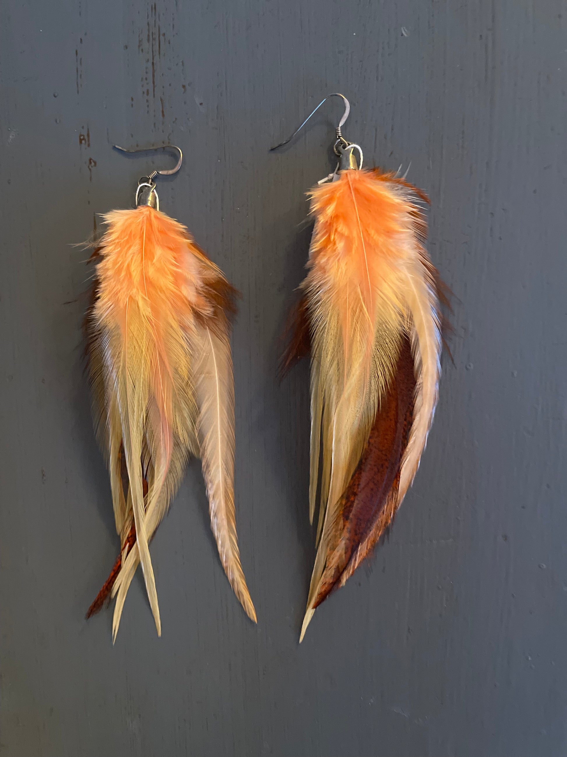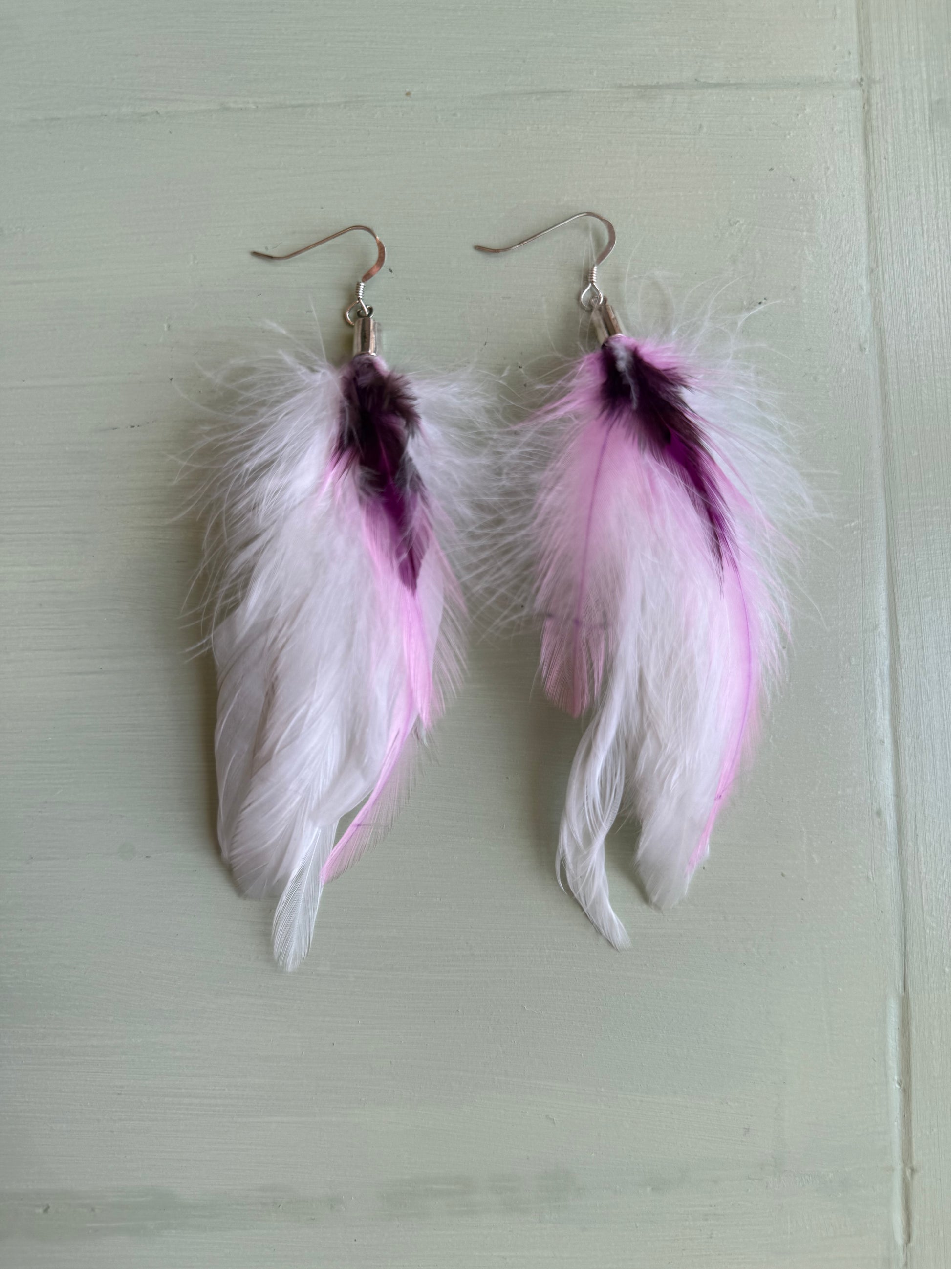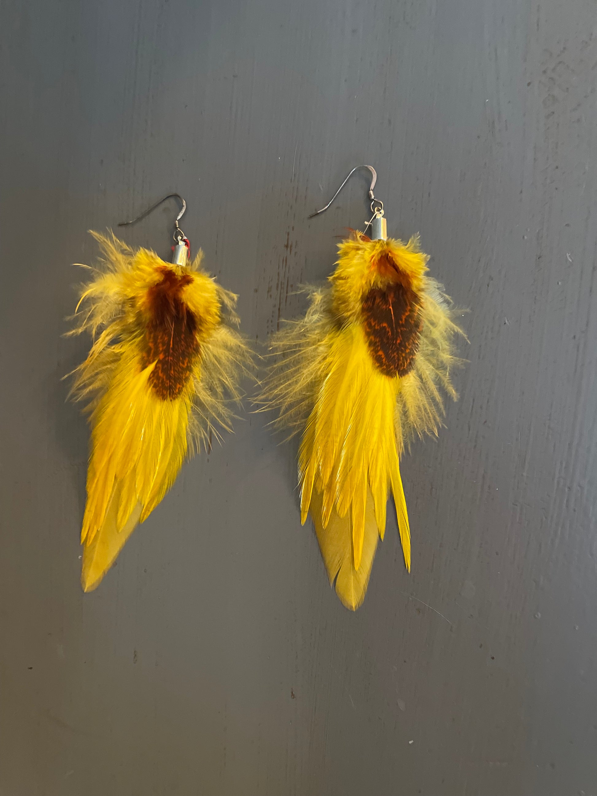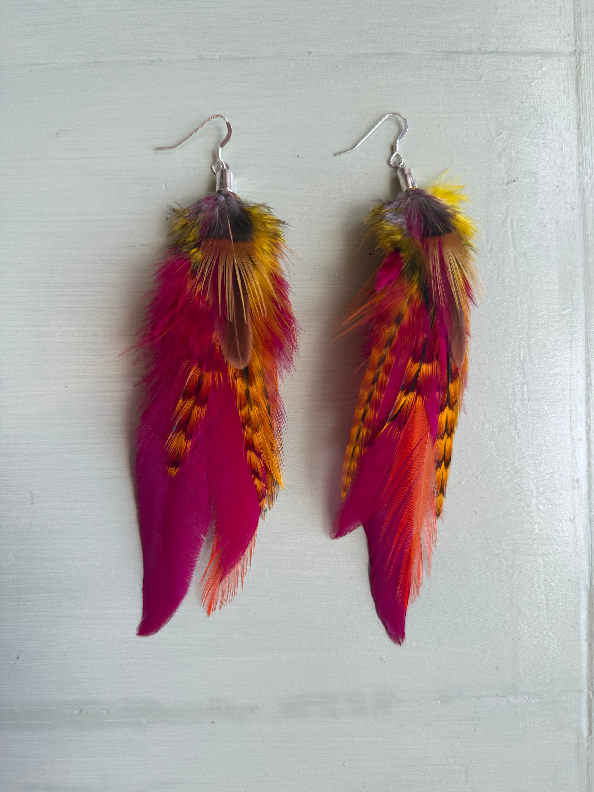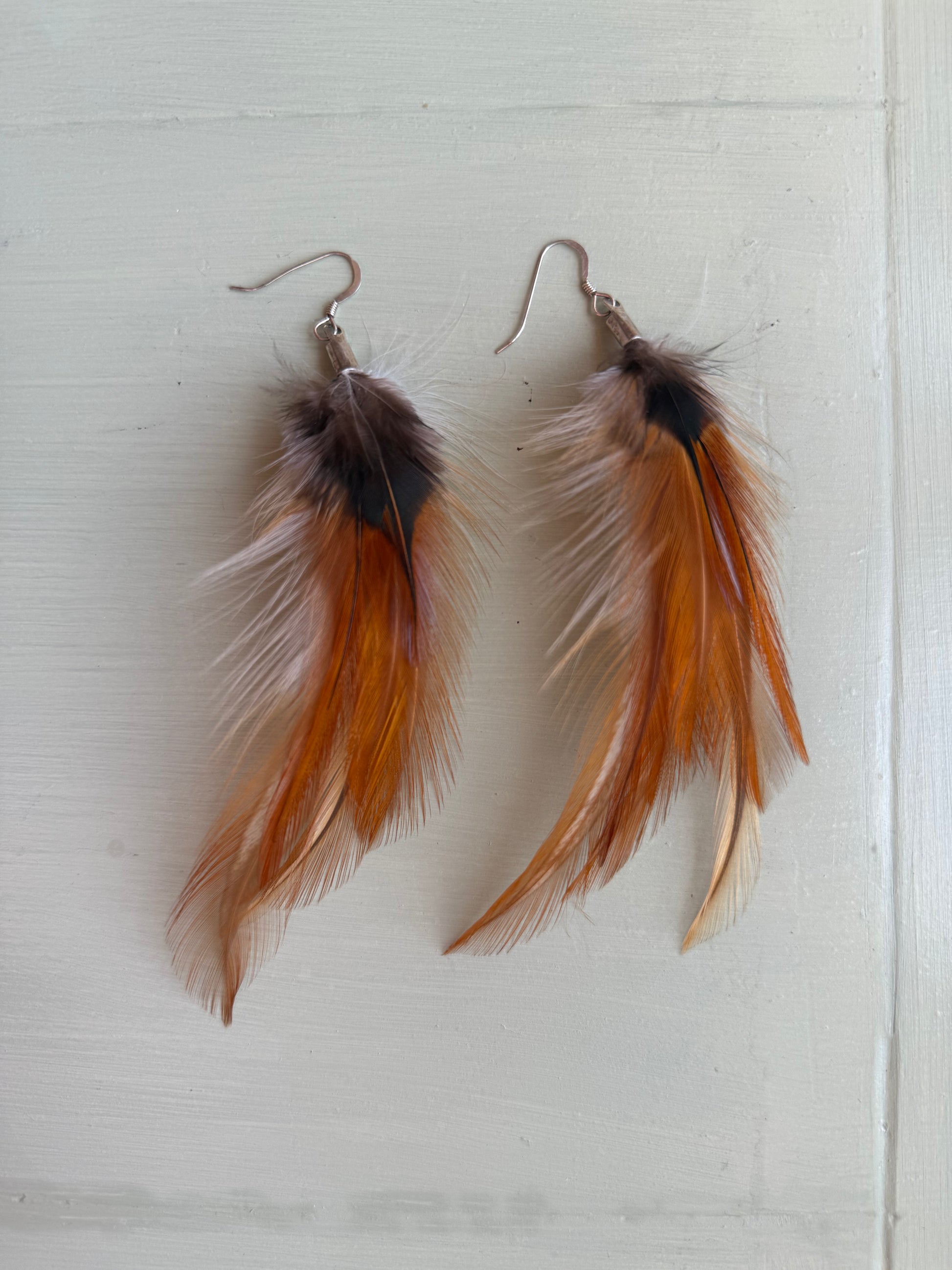 Rosanna gör alla fjäderörhängen i par. En del är naturligt färgade och en del har färgats för hand. Allt mönster på fjädrarna finns där naturligt.