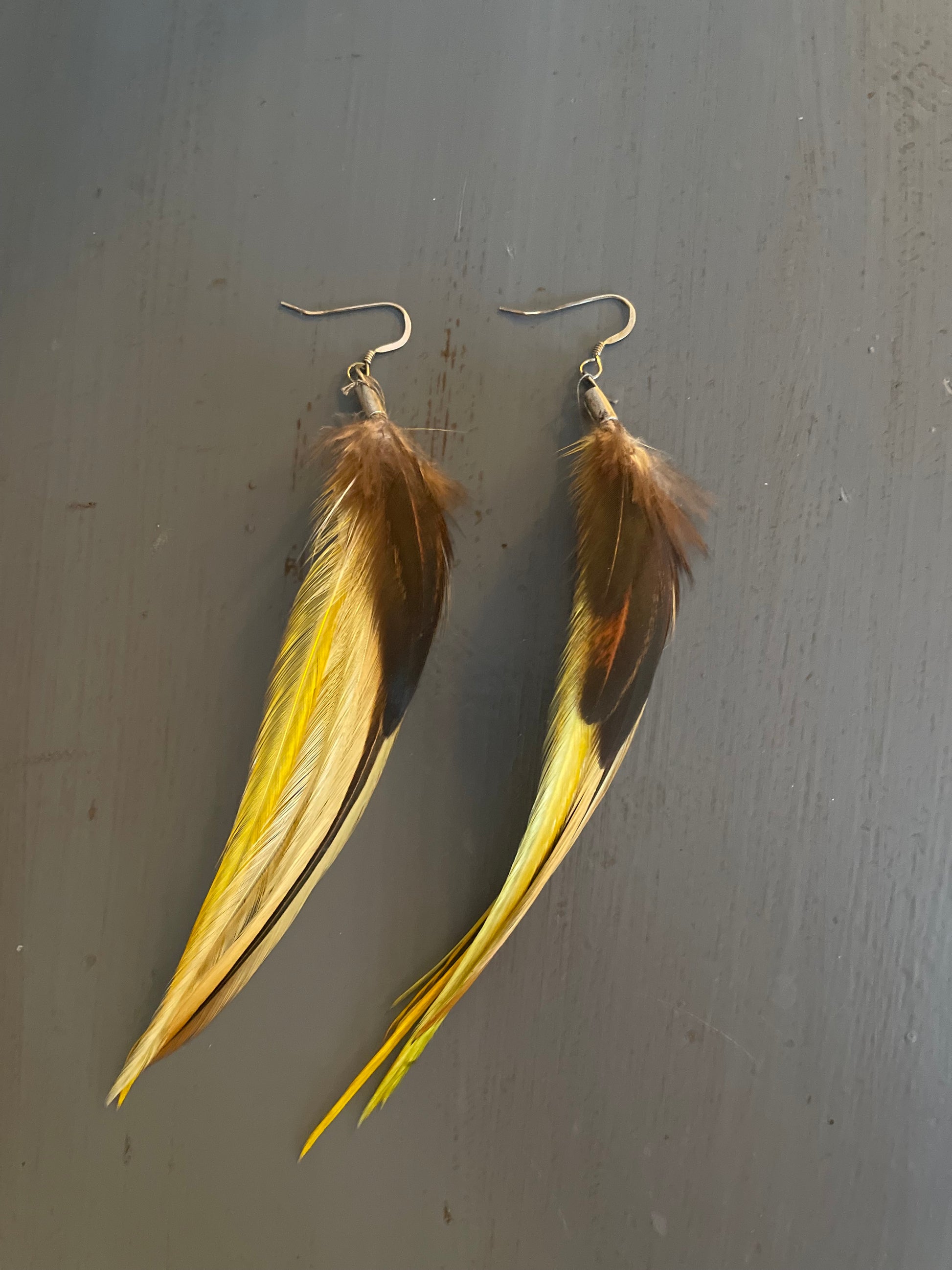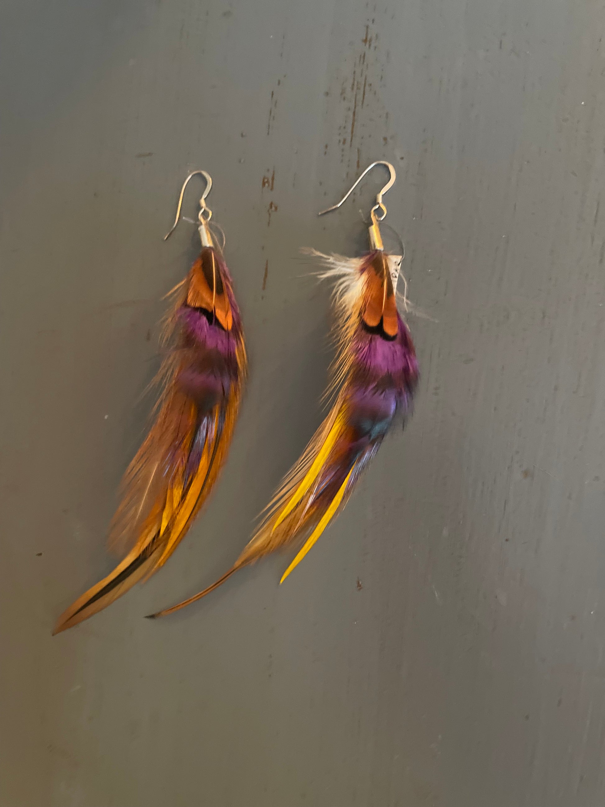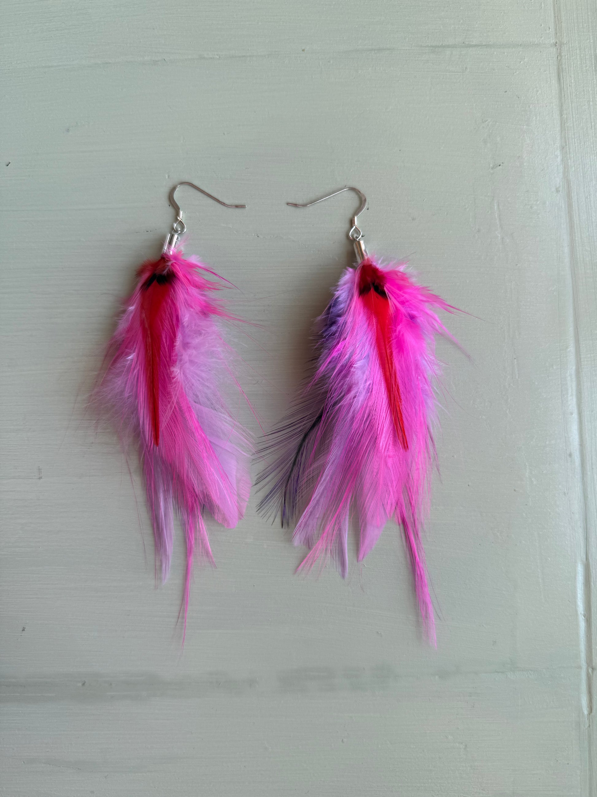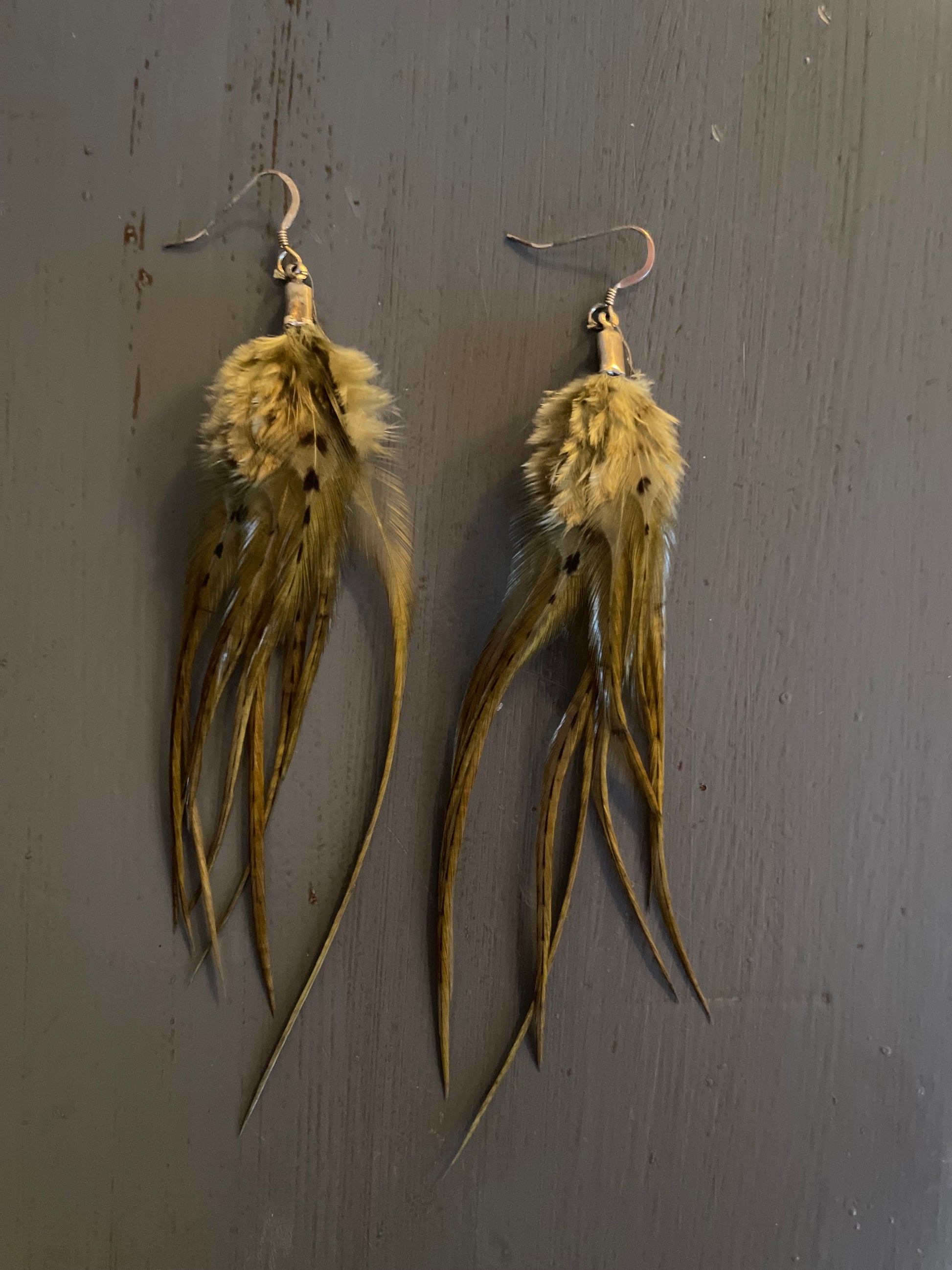 Rosanna gör alla fjäderörhängen i par. En del är naturligt färgade och en del har färgats för hand. Allt mönster på fjädrarna finns där naturligt.