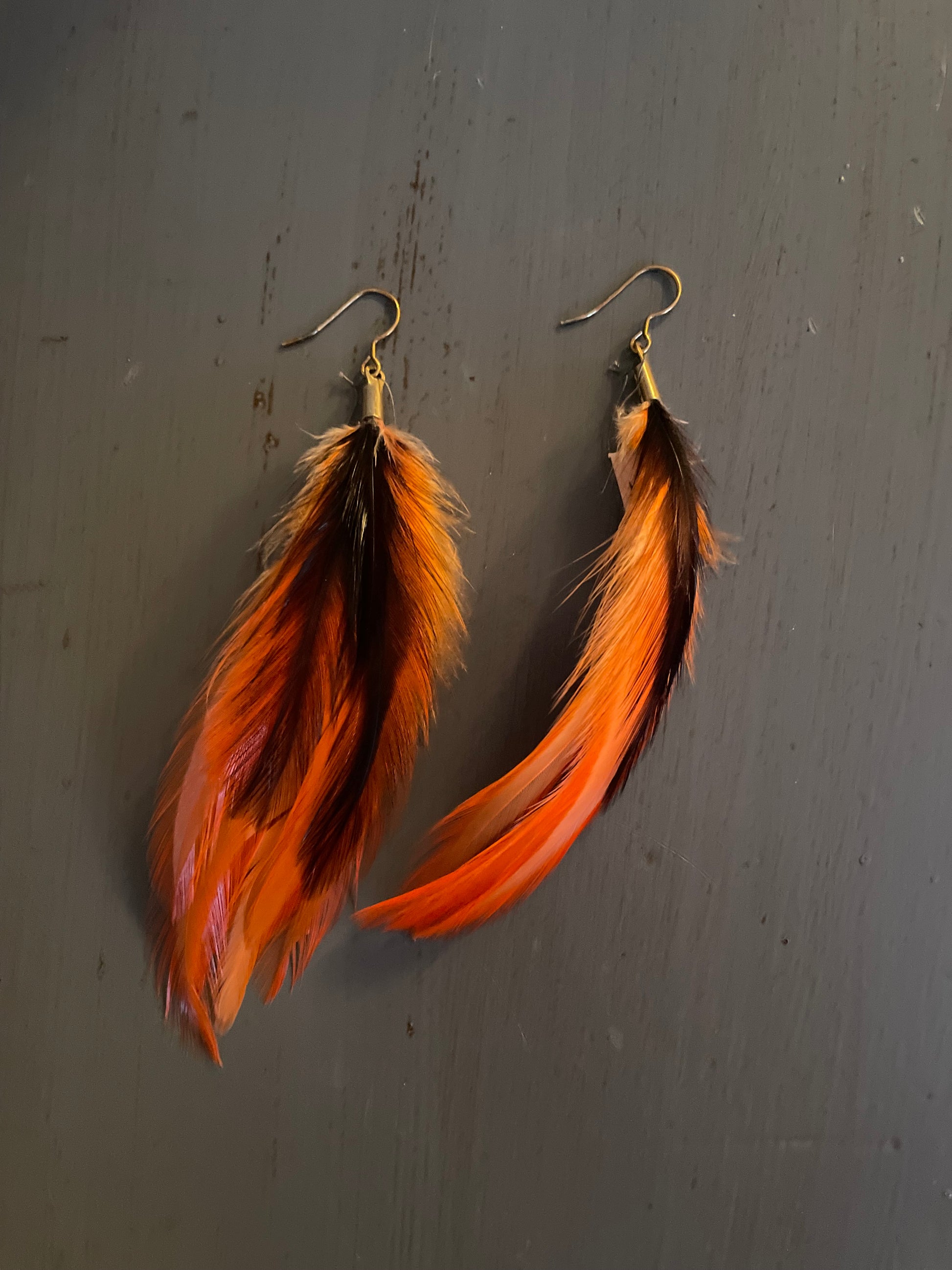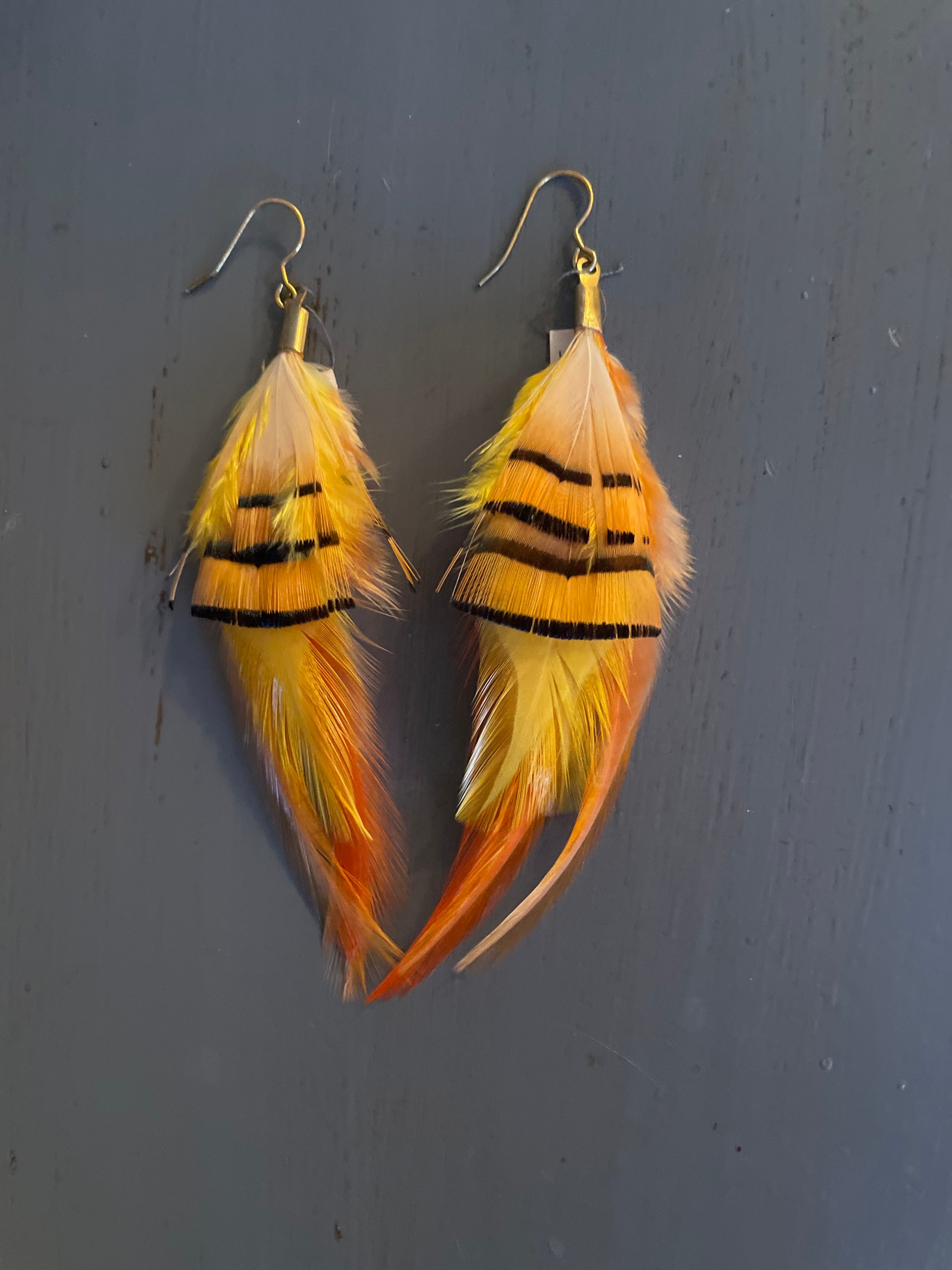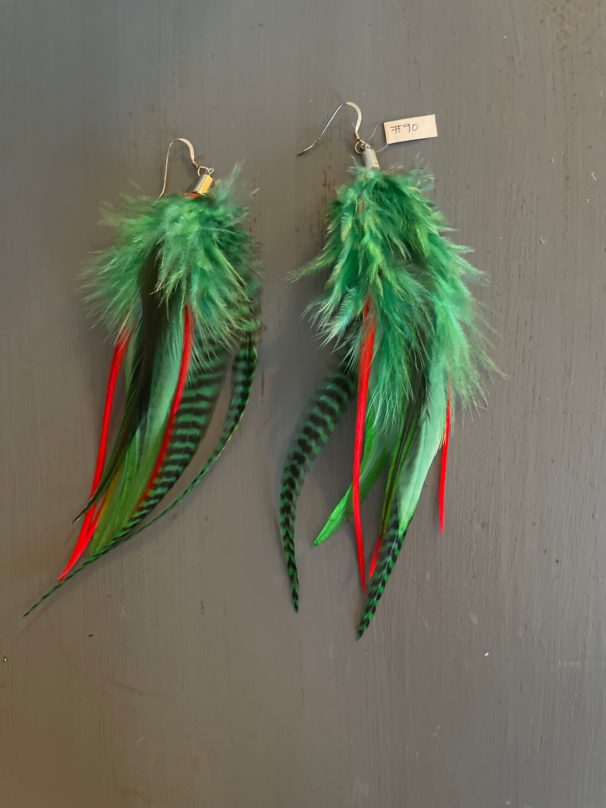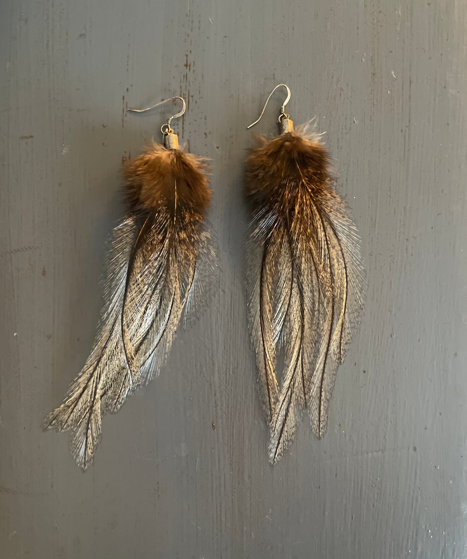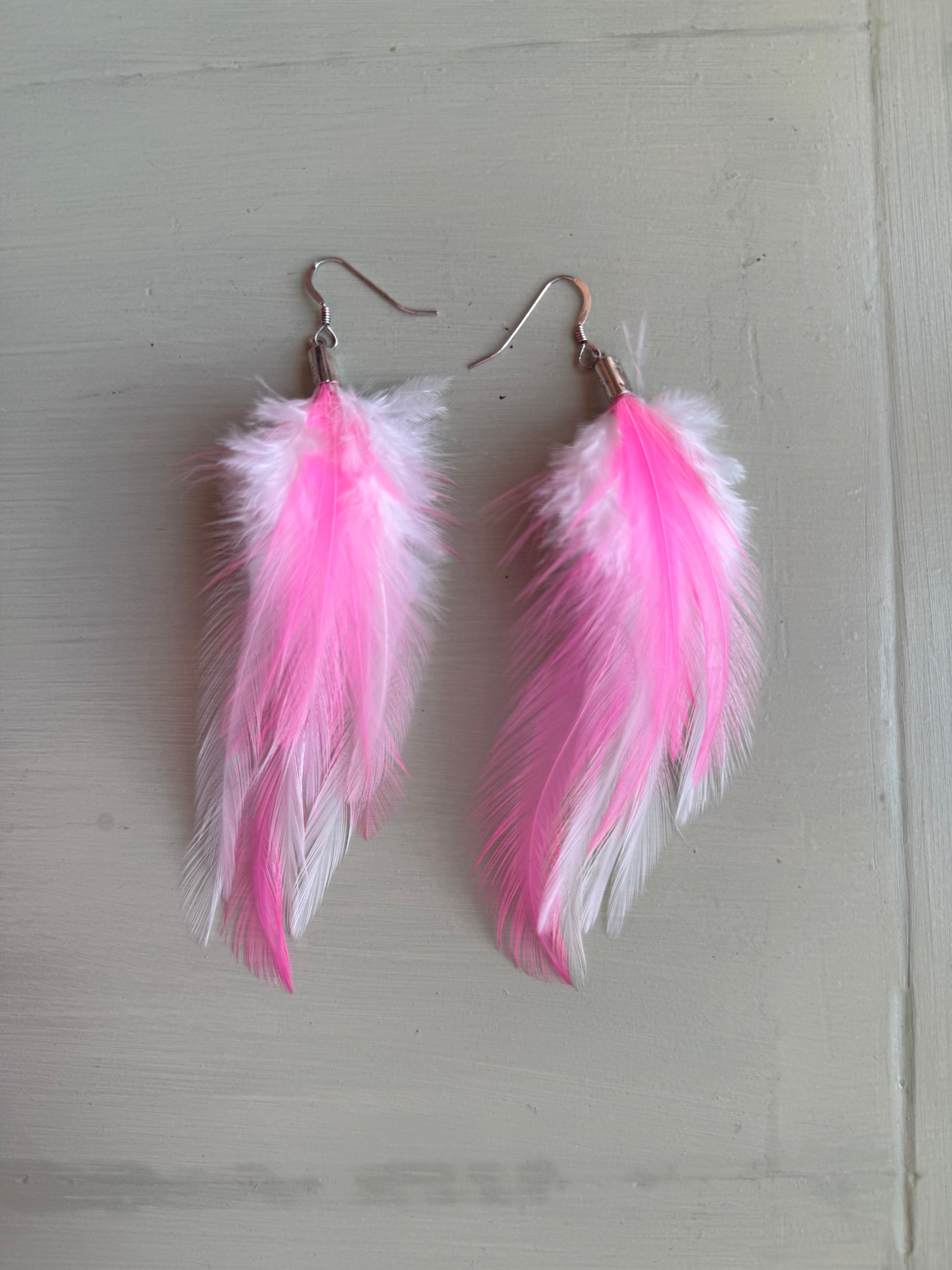 Rosanna gör alla fjäderörhängen i par. En del är naturligt färgade och en del har färgats för hand. Allt mönster på fjädrarna finns där naturligt.