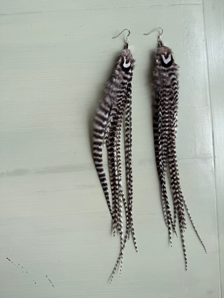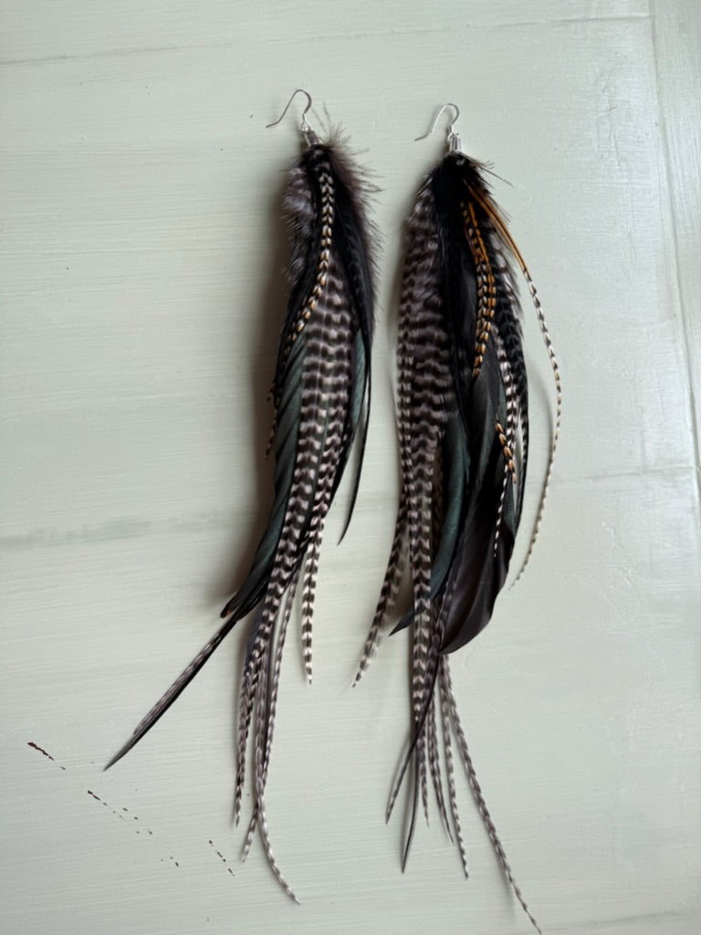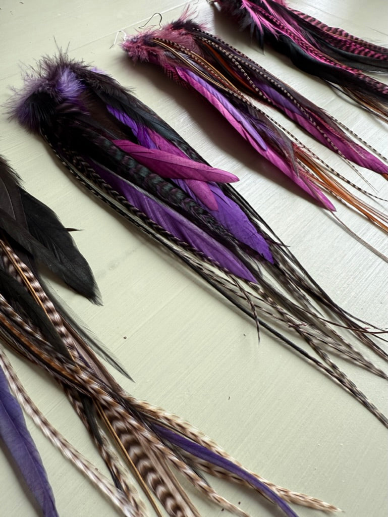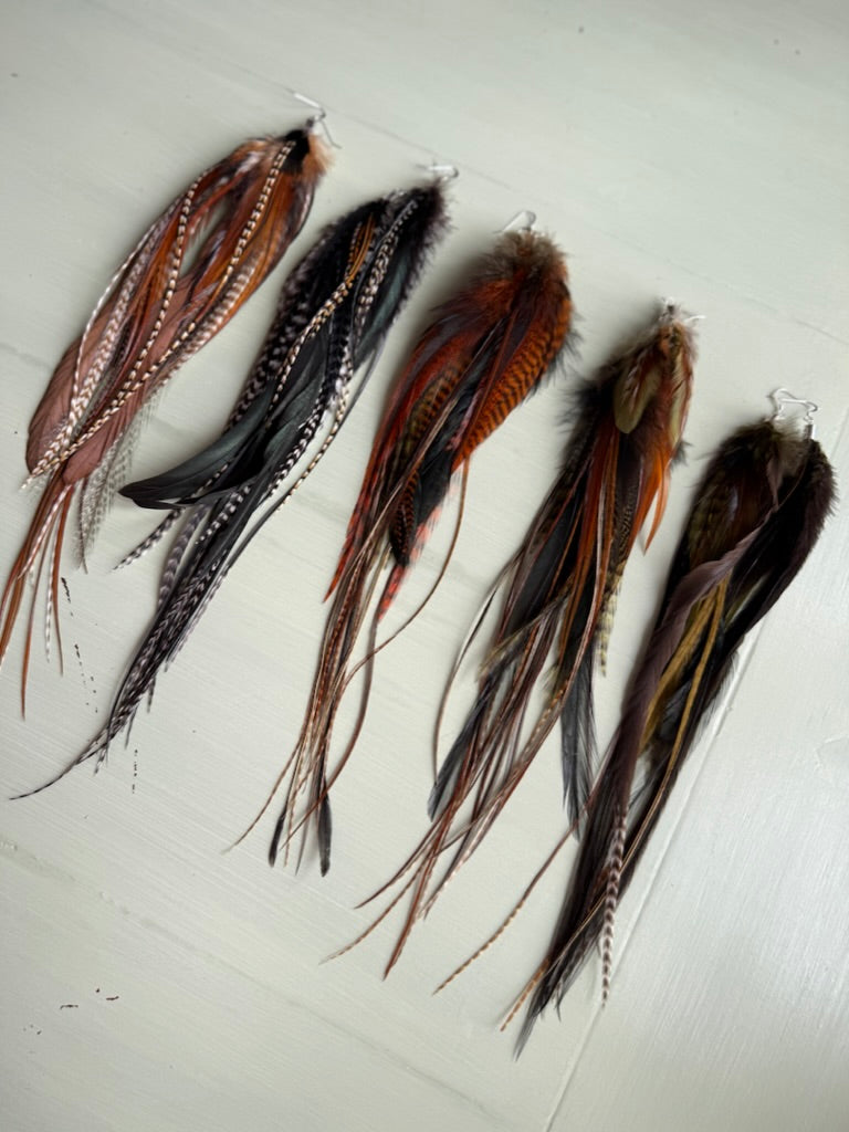 Rosanna gör alla fjäderörhängen i par. En del är naturligt färgade och en del har färgats för hand. Allt mönster på fjädrarna finns där naturligt.