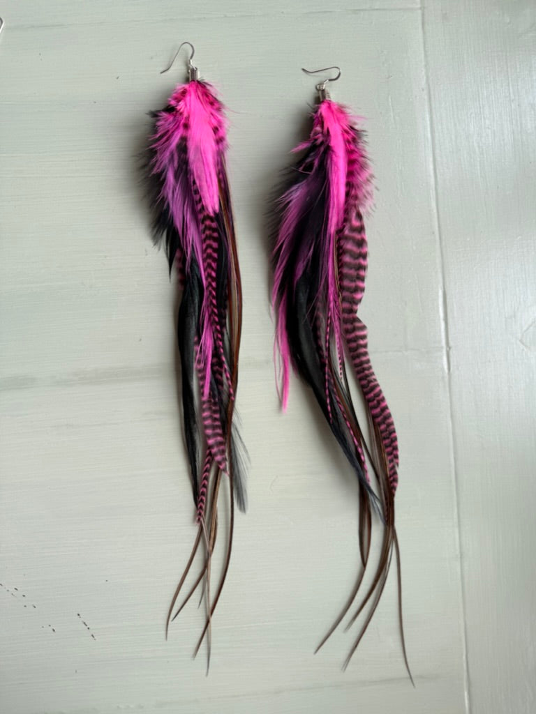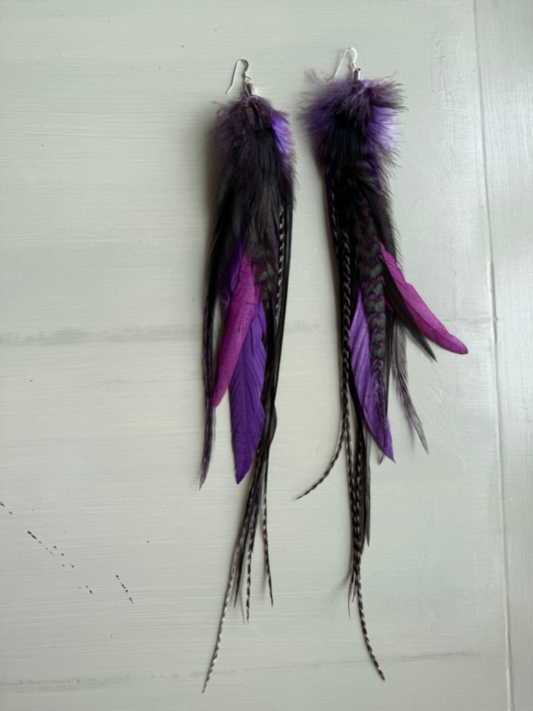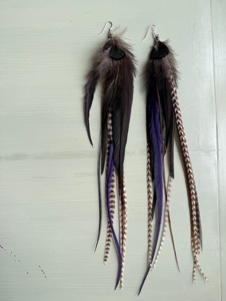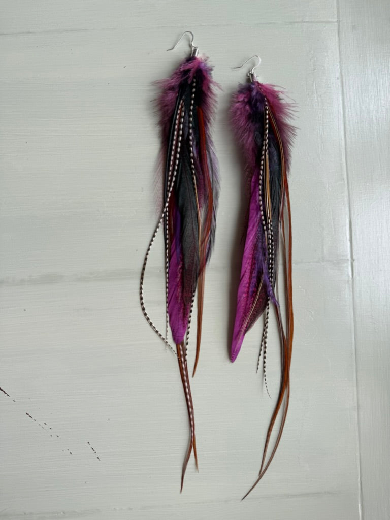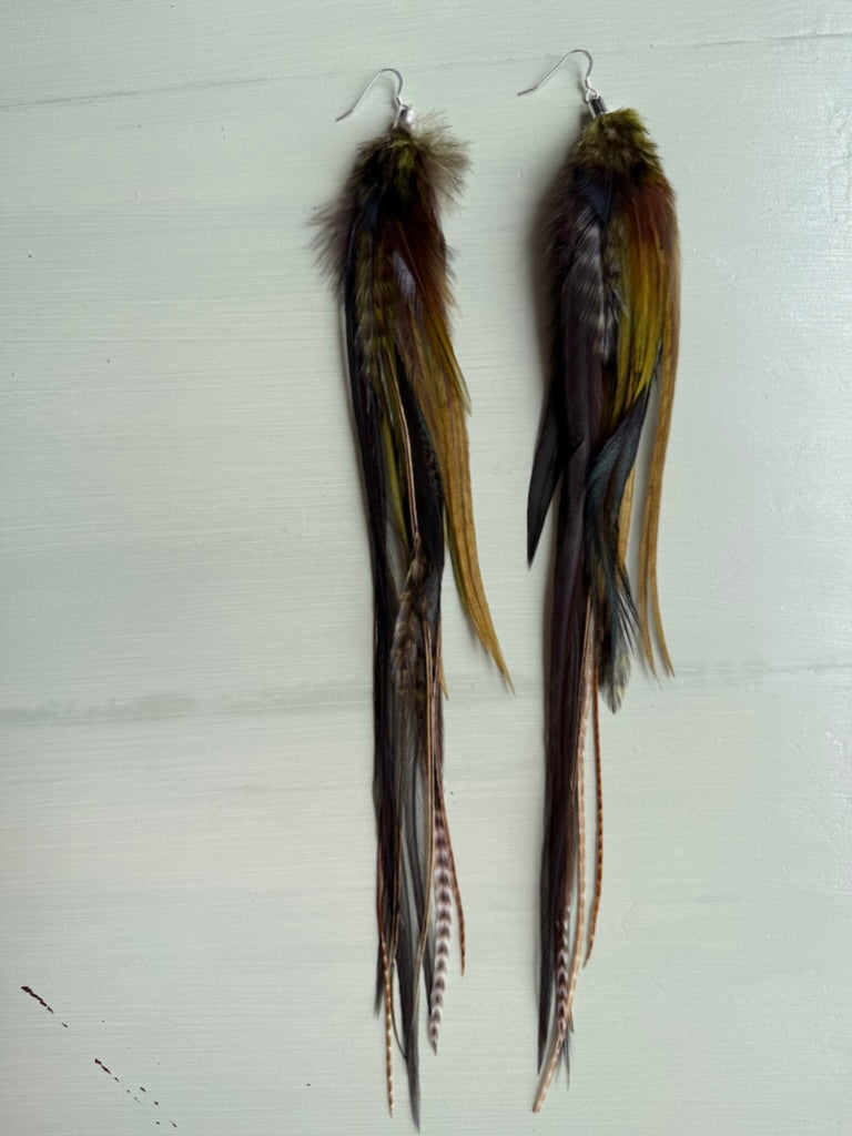 Rosanna gör alla fjäderörhängen i par. En del är naturligt färgade och en del har färgats för hand. Allt mönster på fjädrarna finns där naturligt.