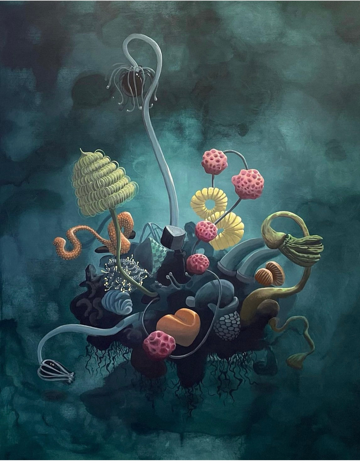 Konsttrycket "The Blue Tuber" är ett tryck från en tavla i akrylfärg målad 2021. Motivet är en surrealistisk rotknöl som flyter i en vacker blå värld.