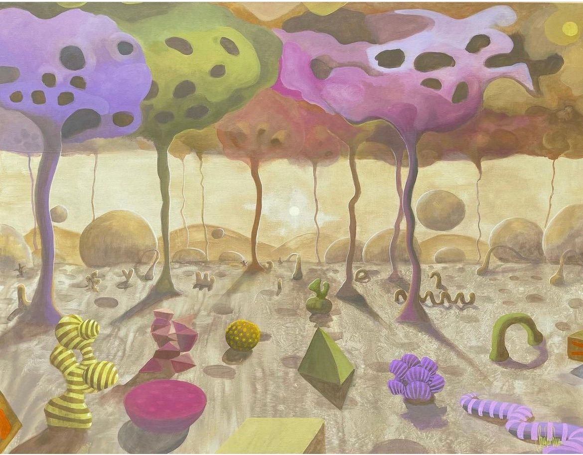 Konsttrycket "UY Scuti Rays" är ett tryck från en tavla i akrylfärg målad 2021. Motivet ska ge en inblick från en annan planet någonstans i närheten av den största upptäckta stjärnan UY Scuti. Det är en värld med former och färger som inte är realistiska. Sandras konst är till för att väcka fantasin och få betraktaren att drömma sig bort, gärna med lite mystik inblandat. Sandra gillar färger och former i harmoni så förutom fantasilandskap skapar hon även abstrakta målningar med inslag av grafiska mönster.